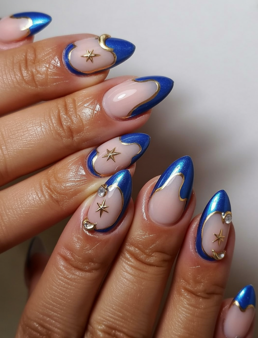 This royal blue nail design appears to belong in a magical kingdom from the world of Disney, featuring a ‘night sky’ appearance that is deep, sparkly, and adorned with golden stars.