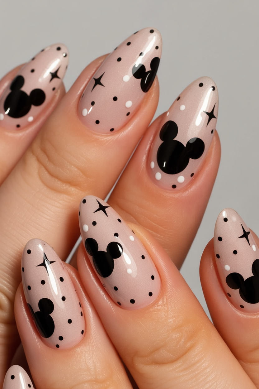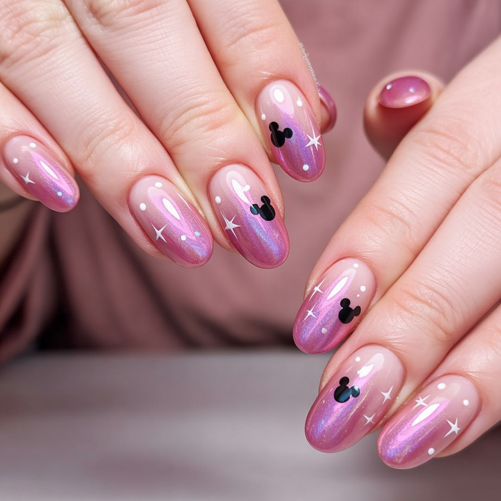 Soft, shining pink that has a dash of magic from Disney—it’s like the nail designs were kissed by stardust. This nail design has a beautiful shine, white dots, and tiny cartoon Mickey Mouse figures that form an artistic nail design that is both fun and elegant. It’s a nail design that feels like it’s from a fairytale, suited for any woman that loves feminine nail inspo along with a dash of nostalgia.
