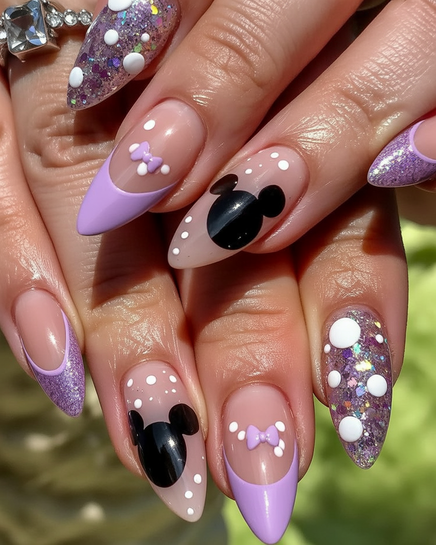 This nail design has a playful, feminine vibe that sparkles and shines through the use of lavender sparkles, white dots, and black Mickey Mouse sketches. This nail design has so many cute elements, making it absolutely magical, elegant, and honestly, perfect for any woman who wants to add a little bit of magic to her nail look.