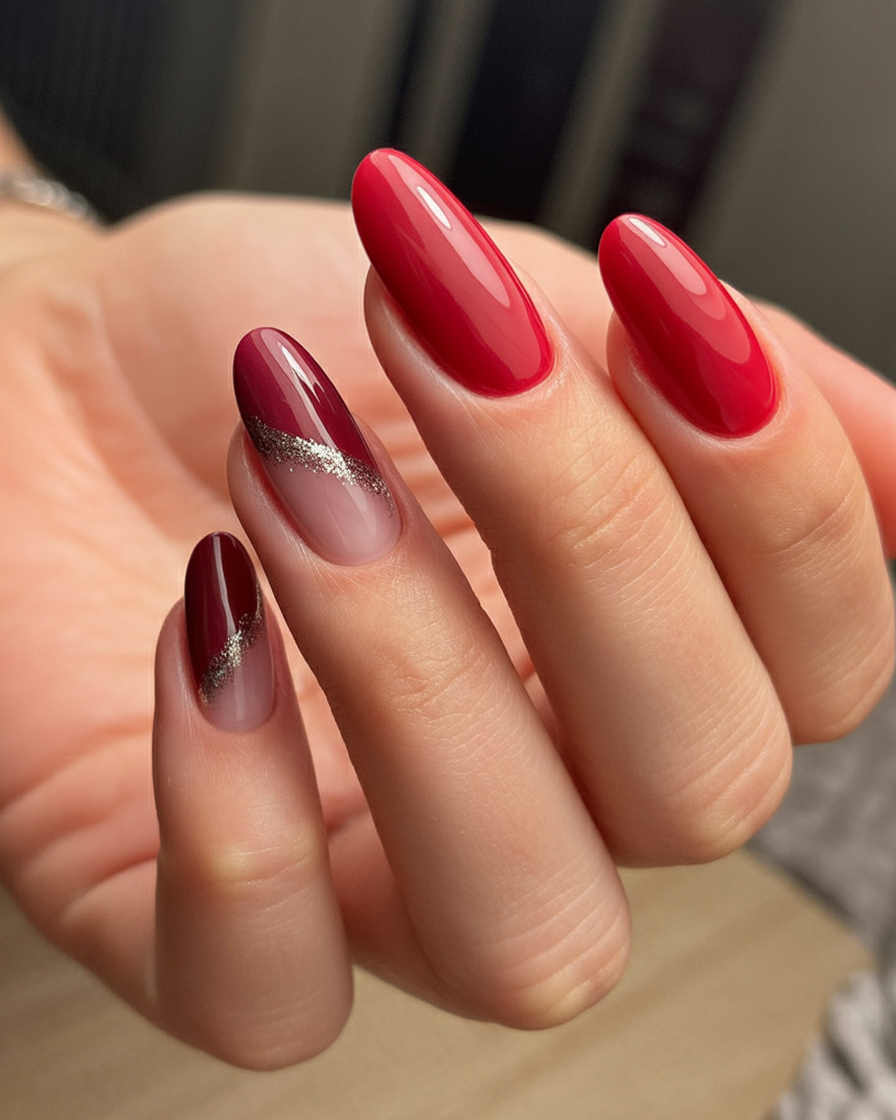 This inspo is also suitable for people with almond-shaped nail polish. This nail polish design is for girls that love simple yet creative designs. The gel finish will keep it strong and glossy, along with the contrast from red and nude, making it chic, well-balanced, and effortless to fall in love with.