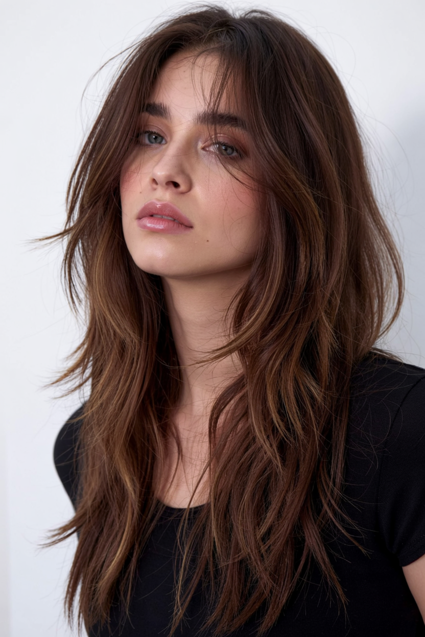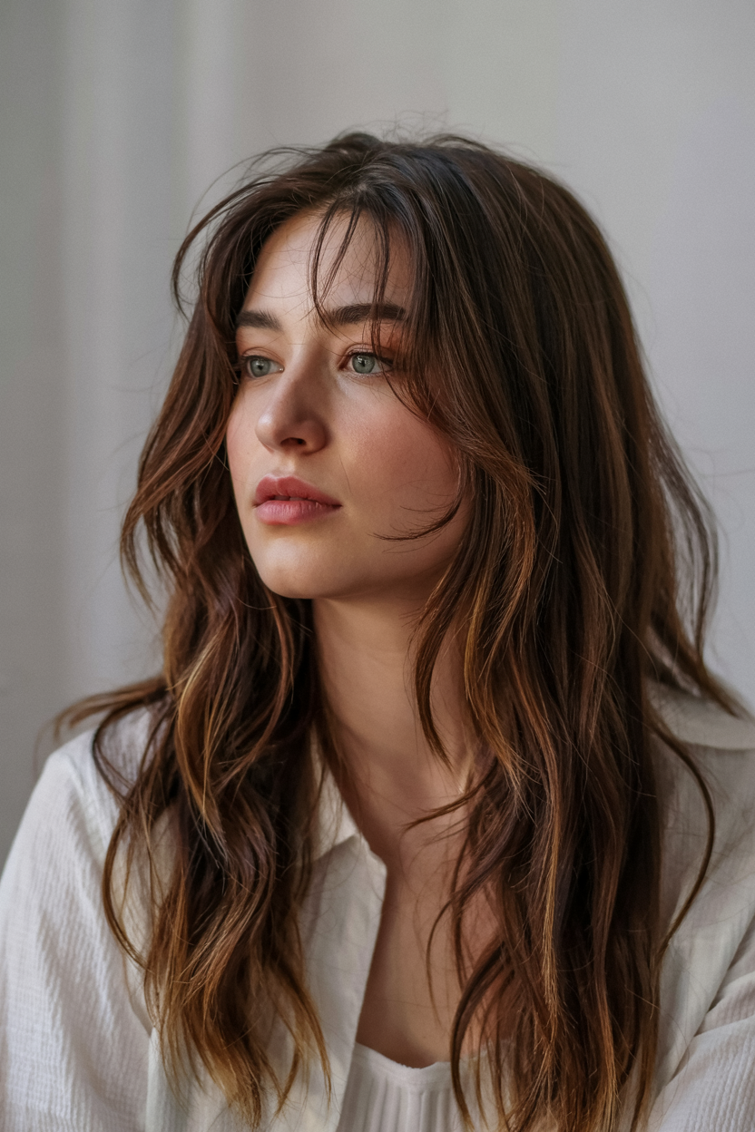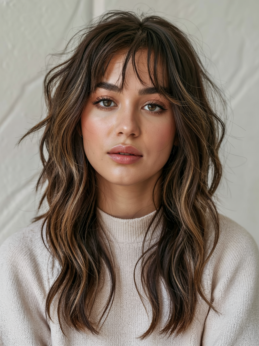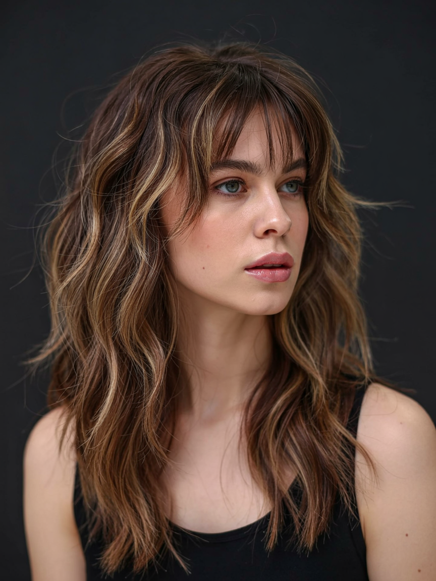 Talk about rocker-chic meets elegance. The style is suited to the woman who desires motion, texture and a little sass. The wispy bangs give out soft strokes and all the body is taken by the layered waves. It is a type of appearance that makes one acknowledge to that spontaneous dinner party.