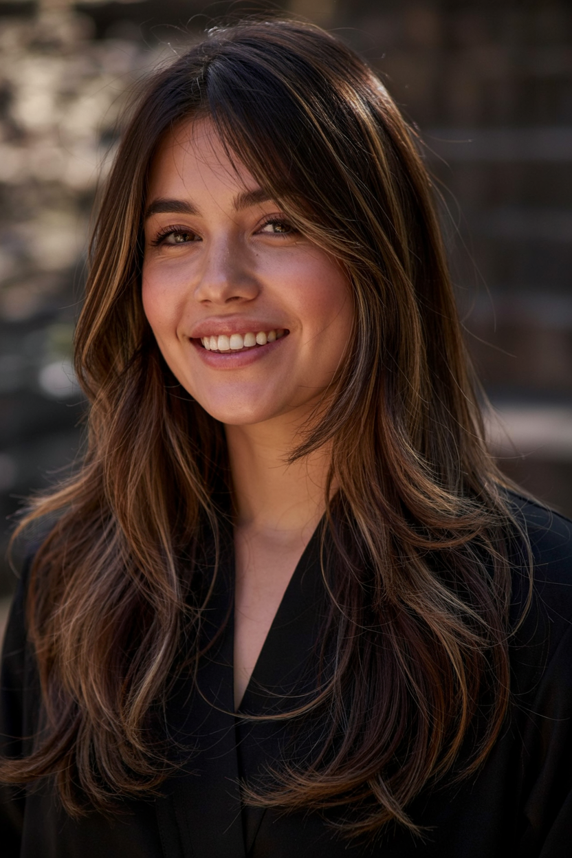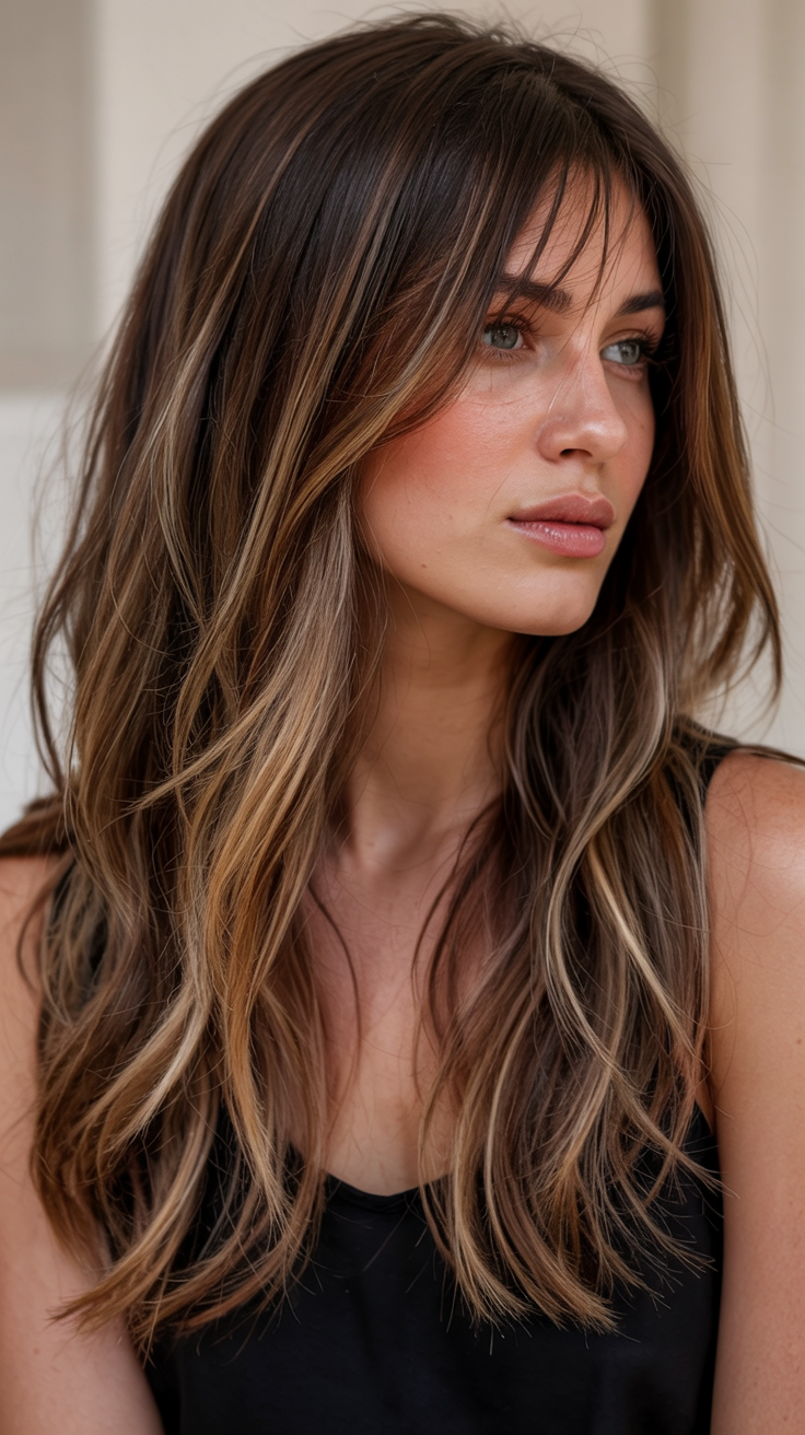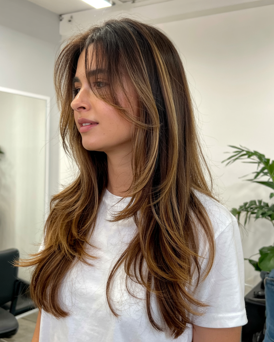 This expression is pure glow and glamour consisting of a soft sunlit air about it. The layers are balanced with the rest in the striking dimension affected by the honey-tone balayage, which is warm and comforting. And the curtain bangs? They softly unveil the face as a frame covering your greatest assets eyes, cheekbones, and your confidence.