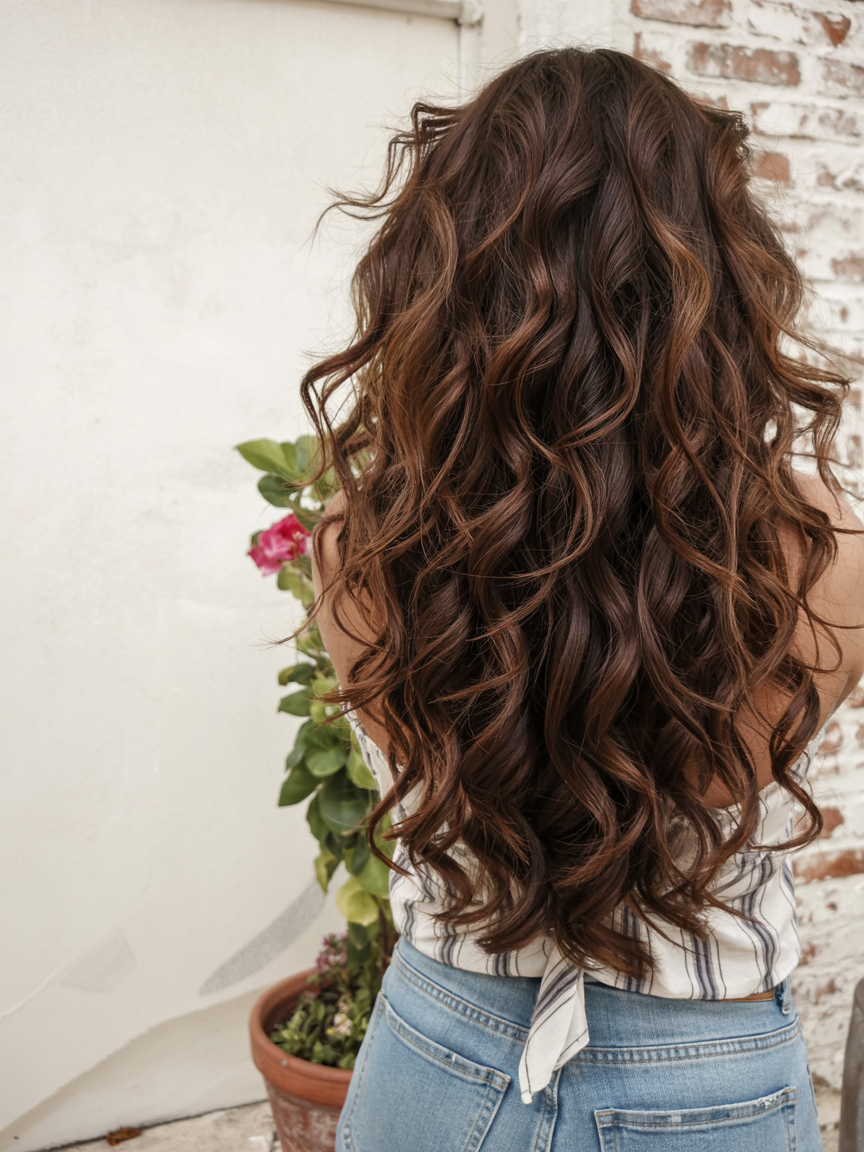 Long voluminous curls which reflect the light in such a way are effortlessly romantic. The cascading rhythm gives this dark brown face framing an ultra-soft look that is youthful but so over-the-top glamorous at the same time- this is the kind of hair that you want to fling behind your back and smile a grin. It is suggestive, carefree and has a lot of character, ideal when you want to draw out your new chapter vibe.