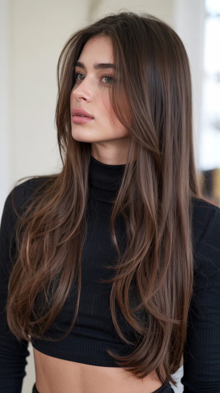 This layered cut whispers refinement without trying too hard. The strokes of texture sweep along as like silk- light, malleable, perfectly flawed along all the right lines. If you’re someone who wants to look put-together without seeming like you spent hours in front of a mirror, this is your power move haircut.