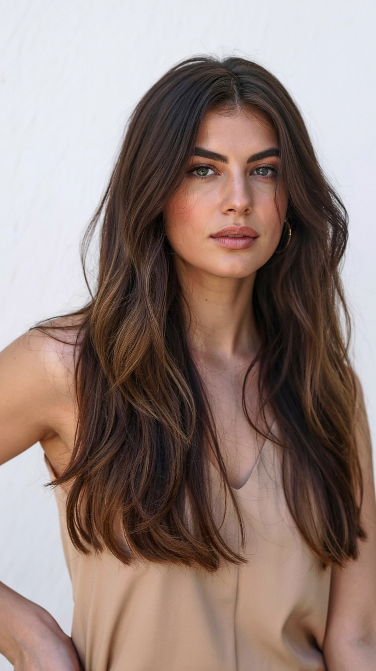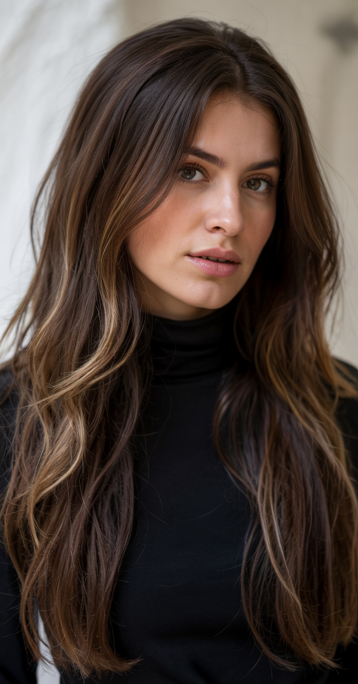 This style delivers major luxe energy. A striking combination of deep-colored chocolate with the gentle additions of the highlights creates a fabulous contrast, which is modern and luxurious. It is brooding, grand and so easily stylish; it feels like a slip into your chicest self with every swivel of the head.
