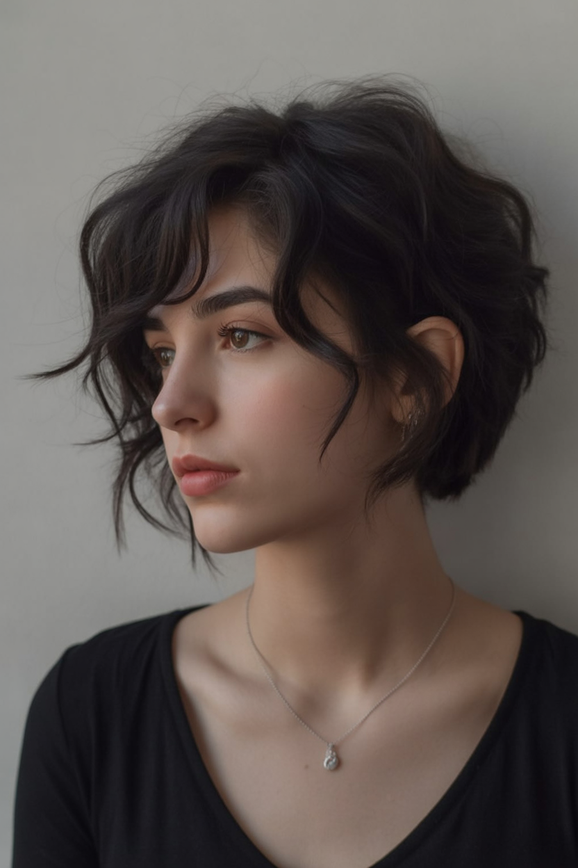 This voluptuous looking wavy cropped pixie is poetry on a moving interface, as the curves are soft and playful. It adds an artistic, free flowing energy to it that should fit is gals going after women that love a cut just as expressive as they are. The side swept bangs are more romantic and the sweep of bangs among the layers provides light and airiness to the hairstyle.