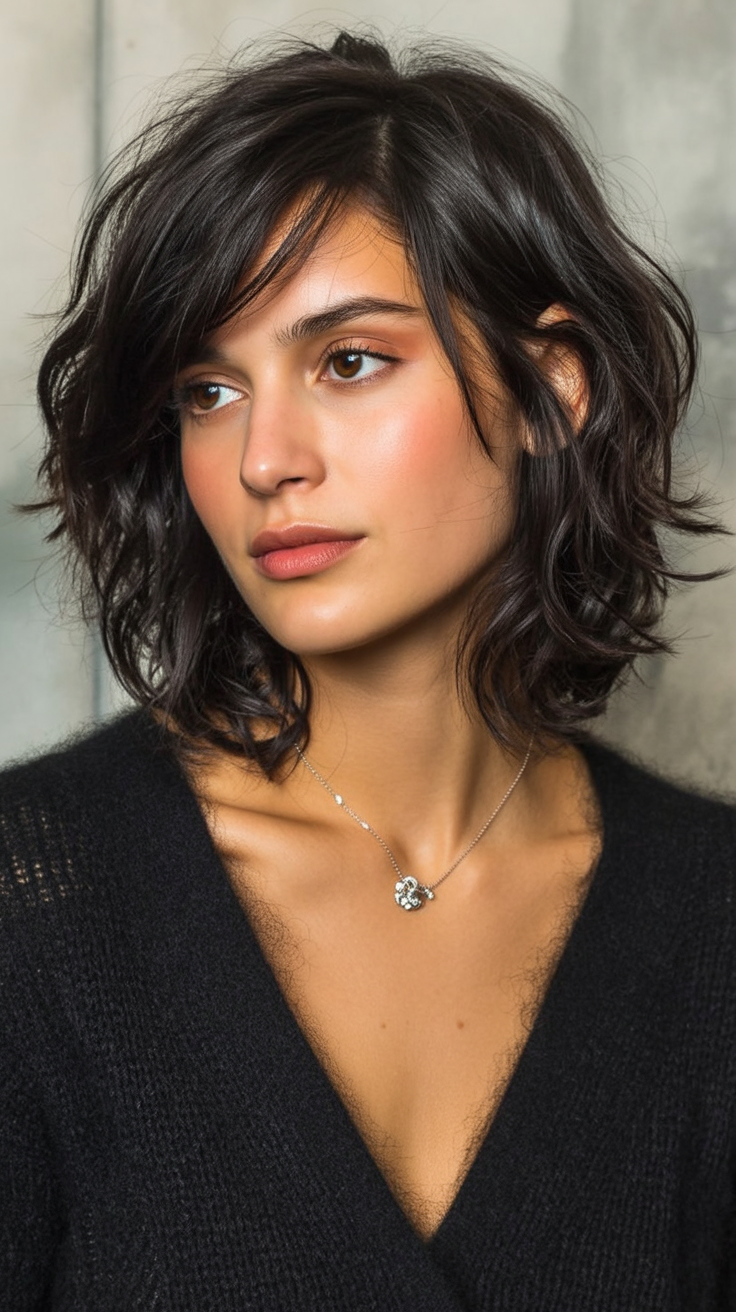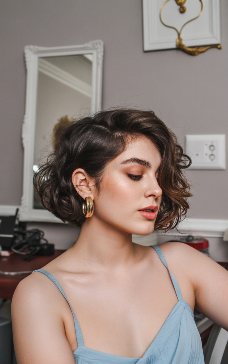 A poetic flavour is added by the softly curled hair and a nipped-in neckline. It’s the kind of cut that looks like it belongs in a French film — romantic, thoughtful, and slightly mysterious. The waves come loose around the face with the movements giving a feel of human life and initiative. It whispers elegance with a hint of playfulness.