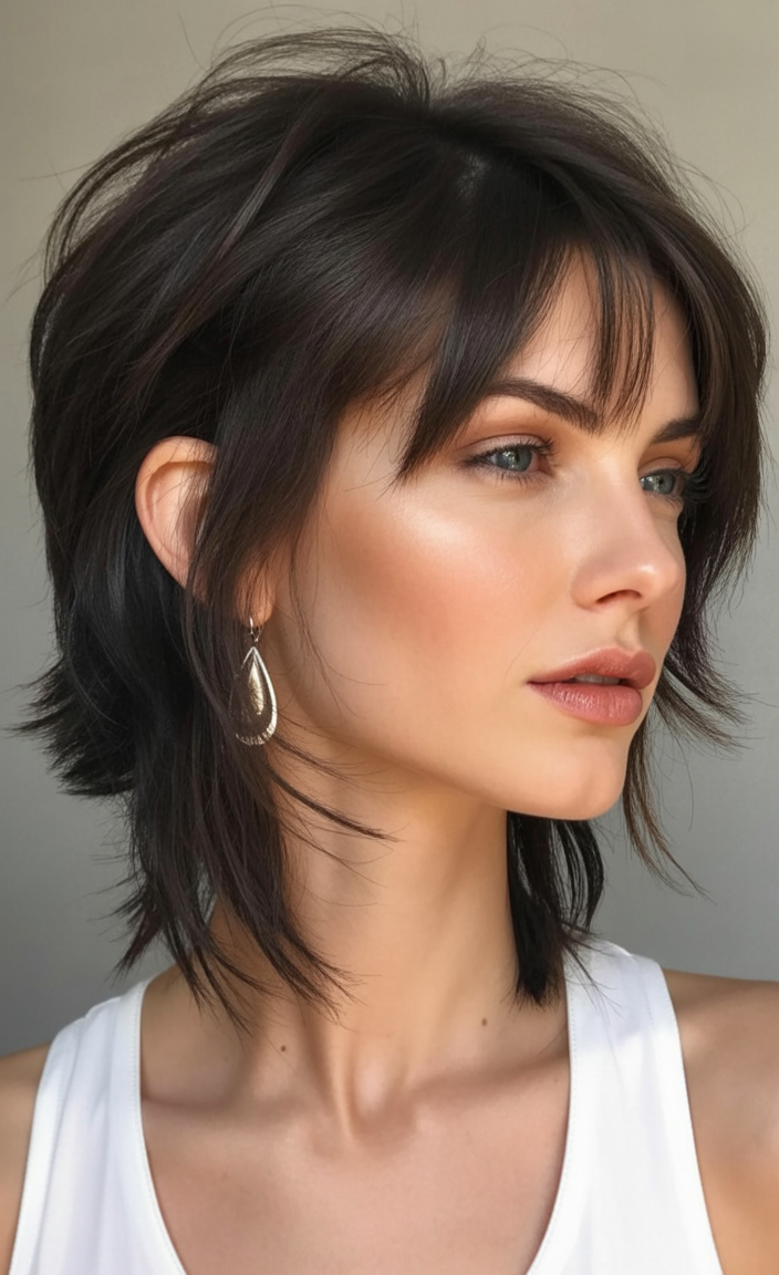 Attitude: This cut comes with it in spades. It’s messy, moody, and modern in the best way. Think rocker-chic meets Parisian poet. The choppy bangs and feathered layers create depth and personality, like you’re the kind of woman who orders espresso, wears statement jewelry, and always knows the best wine on the menu. It’s playful and edgy without trying too hard.