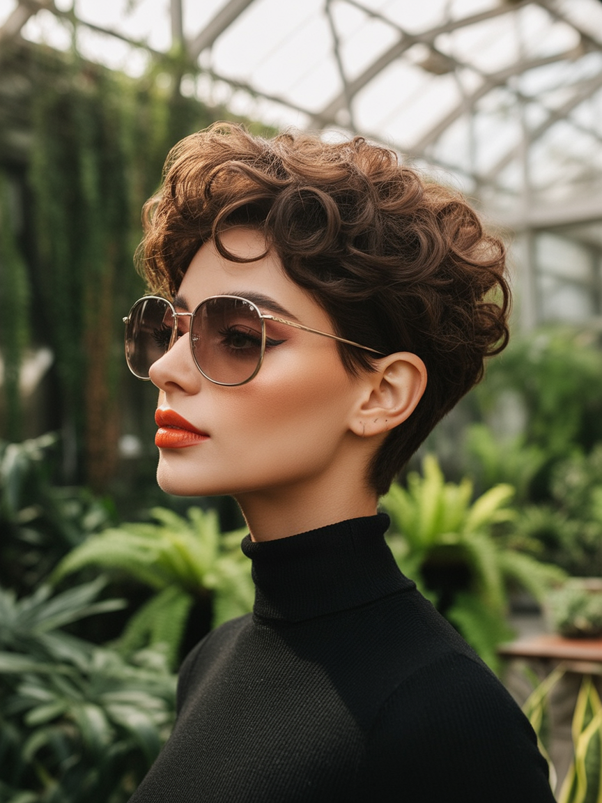 This cut short pixie with curls that are on the top is cheerful and full of confidence. It is fun, up to date and so flattering that you feel you woke up fabulous. The straight sides make it sharp and dramatic whereas the abundant curls on the top give it fun and volume.