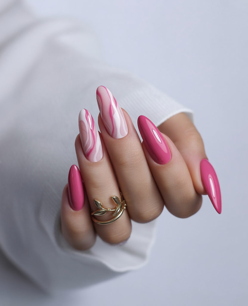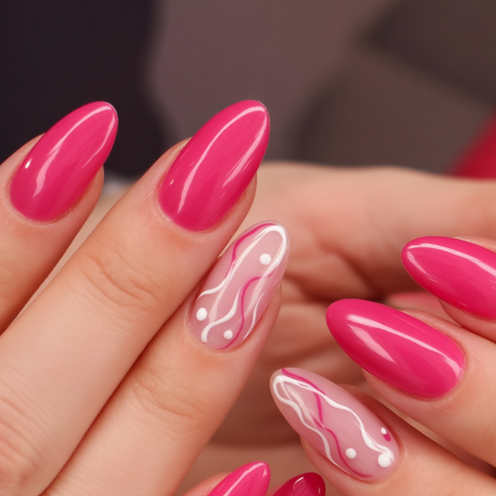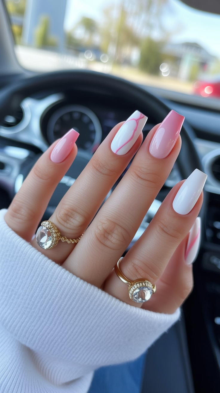 A crisp white meets playful pink in this modern swirl manicure that feels sophisticated yet super fun. The french tip twist and simple curve art keep things stylish without becoming overwhelming — like a designer twist on classic pink nails. It’s polished, cute, and perfect for anyone who wants something youthful without trying too hard.