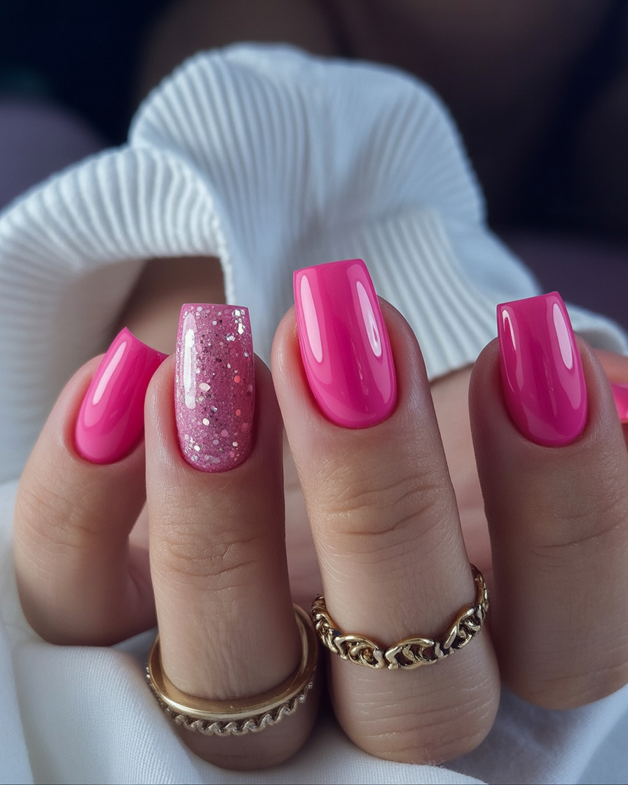 What makes this manicure special is how it blends trendy sparkle tips with a soft base, keeping the look balanced and wearable. The square shape gives it structure, while the glitter keeps it fun. If you want inspo easy nails that transition from errands to evening plans, this pink ombre does it all — and it plays beautifully with warm gold jewelry or simple rings.