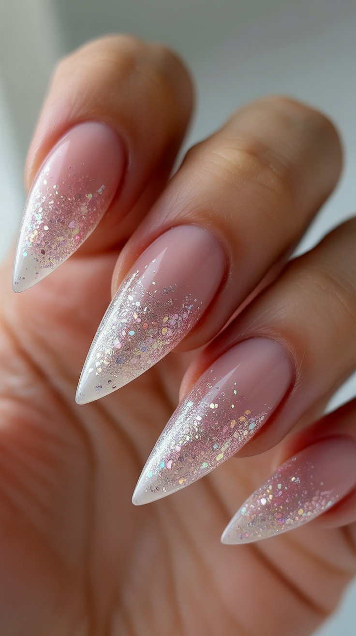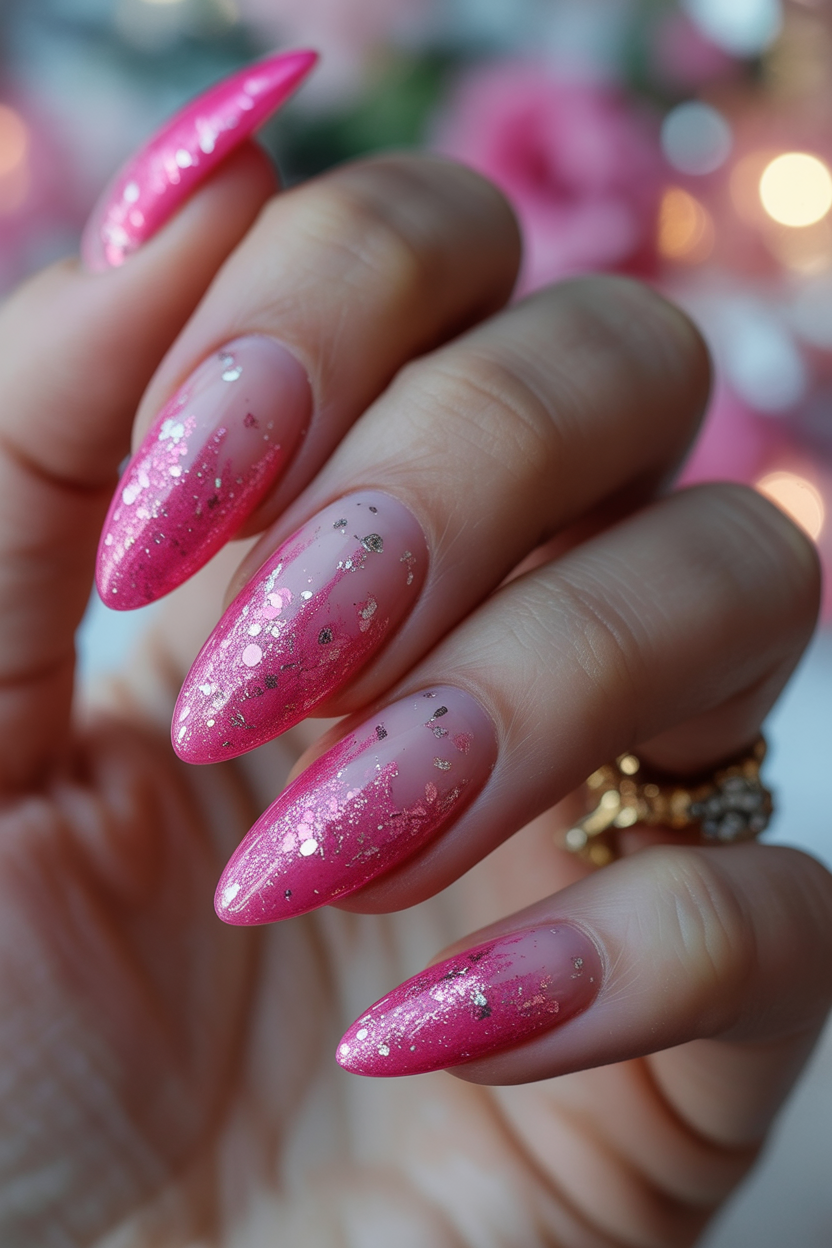 These nails feel like a fun night out wrapped in a manicure — bright pink tips melting into soft blush with scattered glitter that looks like fairy lights dancing across your nails. It’s bold, feminine, and a little dramatic in the best way, perfect for someone who loves color but still wants something beautifully blended and wearable.
