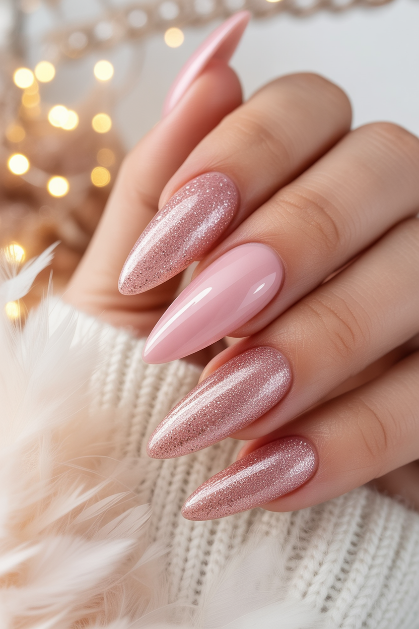 If you love long almond nails, this is a beautiful inspo easy look to recreate. The glitter gives it that art-like feel without needing complex designs, and the pink undertone keeps things feminine and classic. Perfect with chunky knitwear, gold jewelry, or even a simple french tip in future for variation — this is one of those timeless pink ideas you’ll come back to again and again.