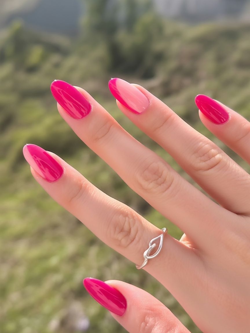 The vibe here is confident and joyful — think pink lipstick, sparkly diamonds, and a playful spirit. This design works wonderfully on almond nails and suits both acrylic and natural styles. The neon fade stays bright and fun, making this a great inspo option if you’re craving something vibrant but still elegant enough for everyday life.