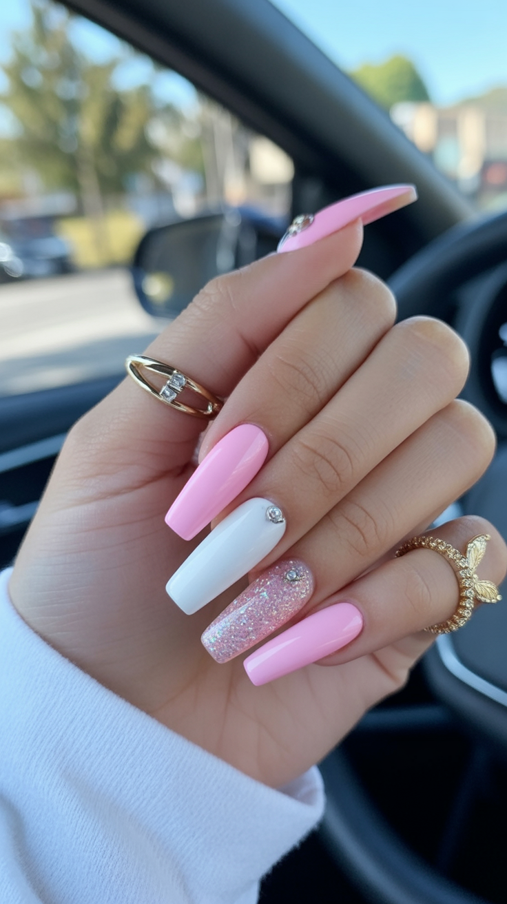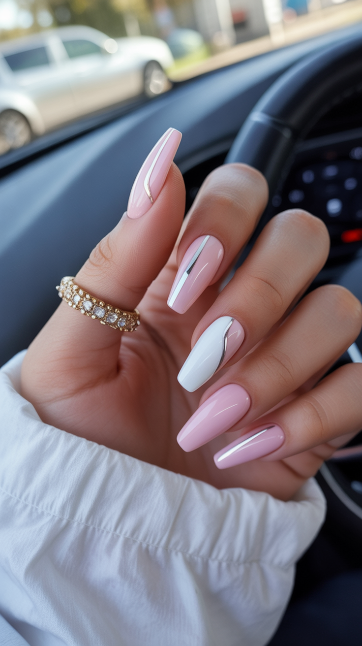 Soft pink paired with crisp white and a sleek metallic line — this manicure feels modern, elevated, and quietly confident. The glossy finish adds a polished glow, and the thin metallic stripe gives a chic architectural touch. This isn’t just cute — it’s stylish in a subtle, grown-up way, like a favorite cashmere coat or fresh nude lipstick that instantly lifts your mood.