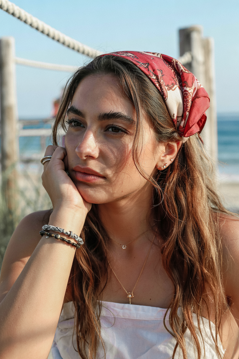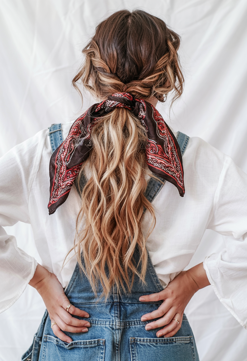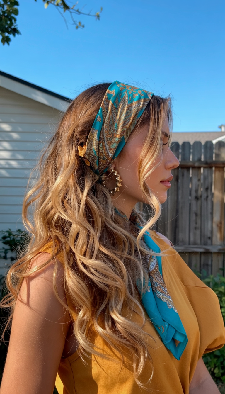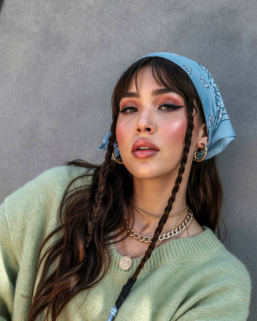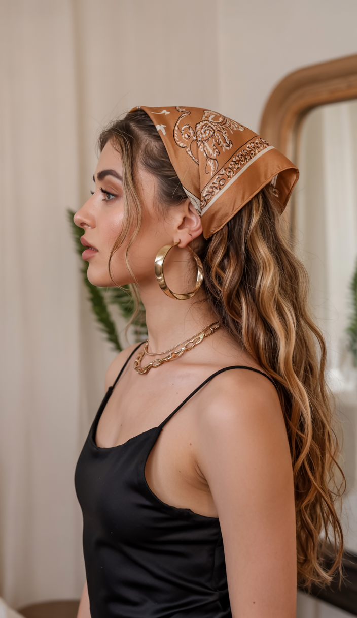 It is almost whimsical and graceful to combine long waves and thin braids with a bandana knot. It is the sort of gaze that you would put on when you want your garment summer-ready but still a bit mysterious, as though you were heading to an open-air concert or a leisurely brunch under the sun. The chains and hoops of gold are a small touch of glitz, but the scarf makes this a statement style, part boho, part sleek.