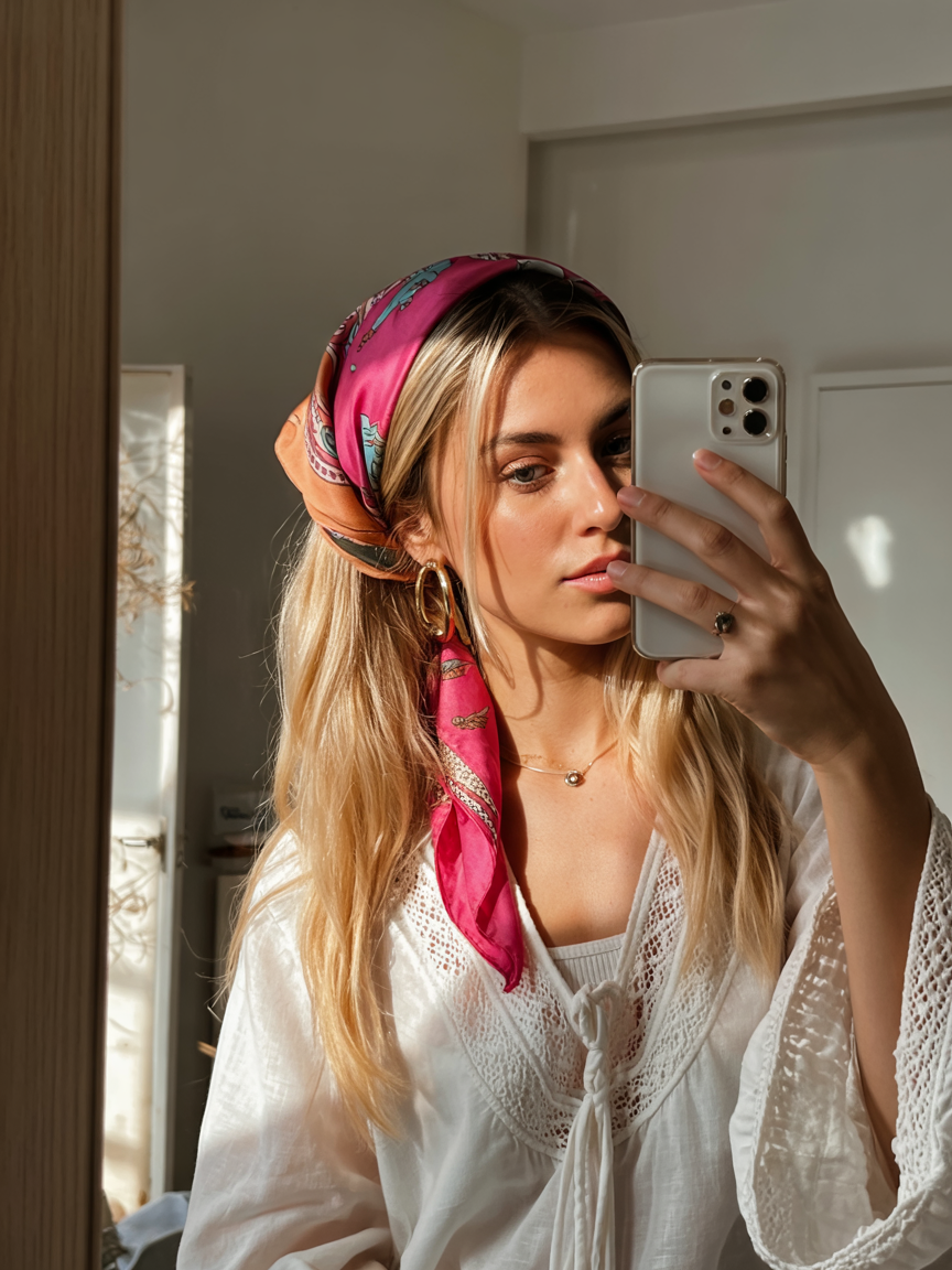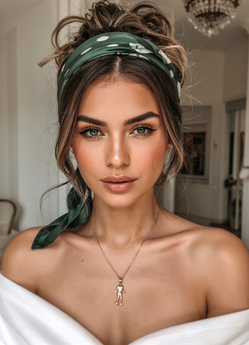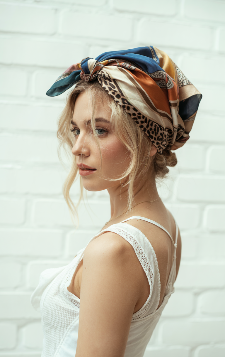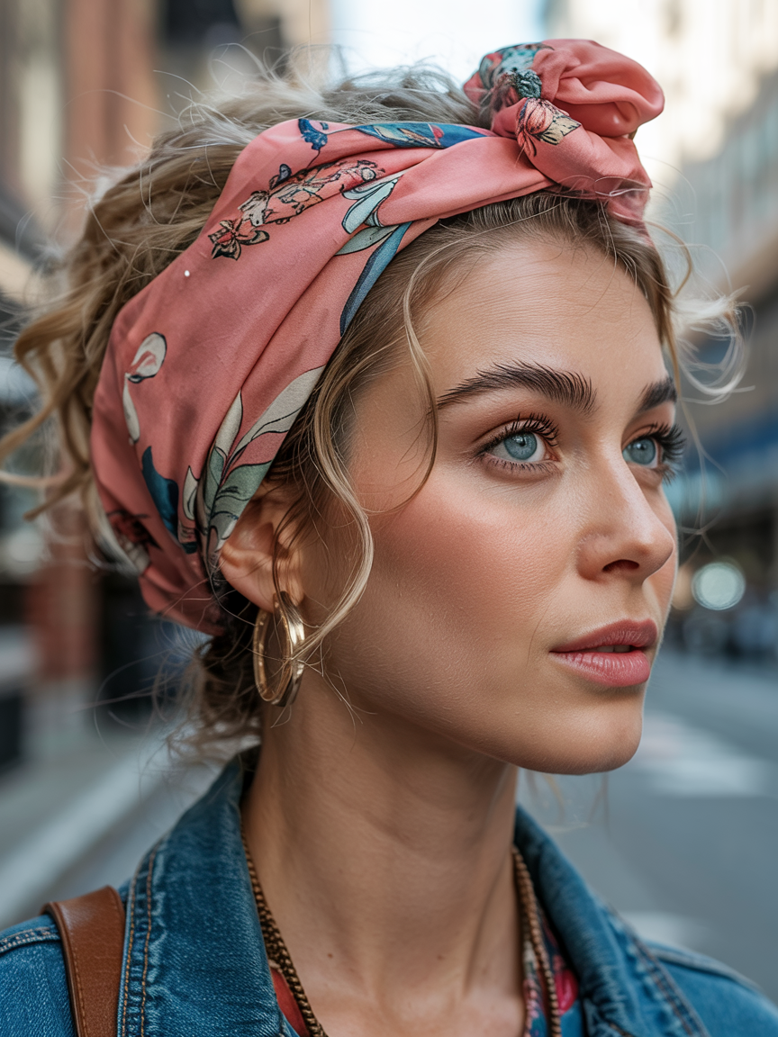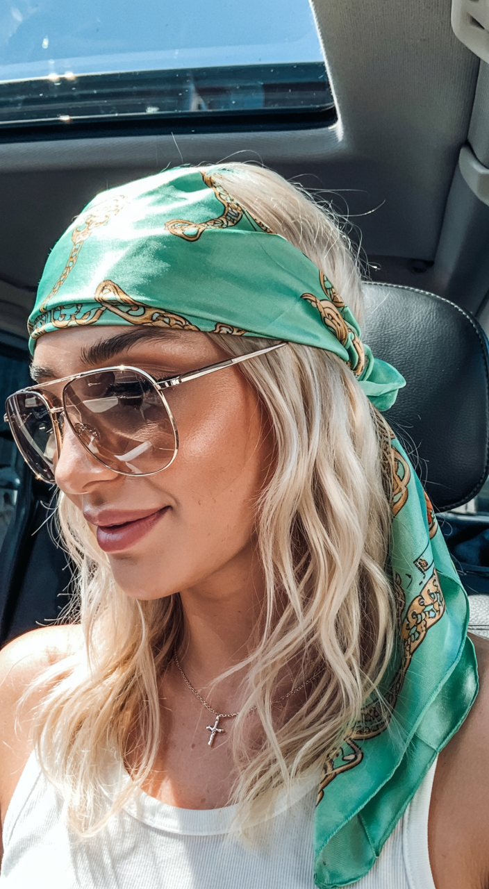 A mint green scarf wrapped low on the forehead is a pure retro fun when worn with wavy blonde hair. It is decidedly Y2K, a bit beachy, a bit throwback. Toss on some extra-large sunglasses and you immediately get that free-and-easy road trip vibe – it is cool, yet not so serious.