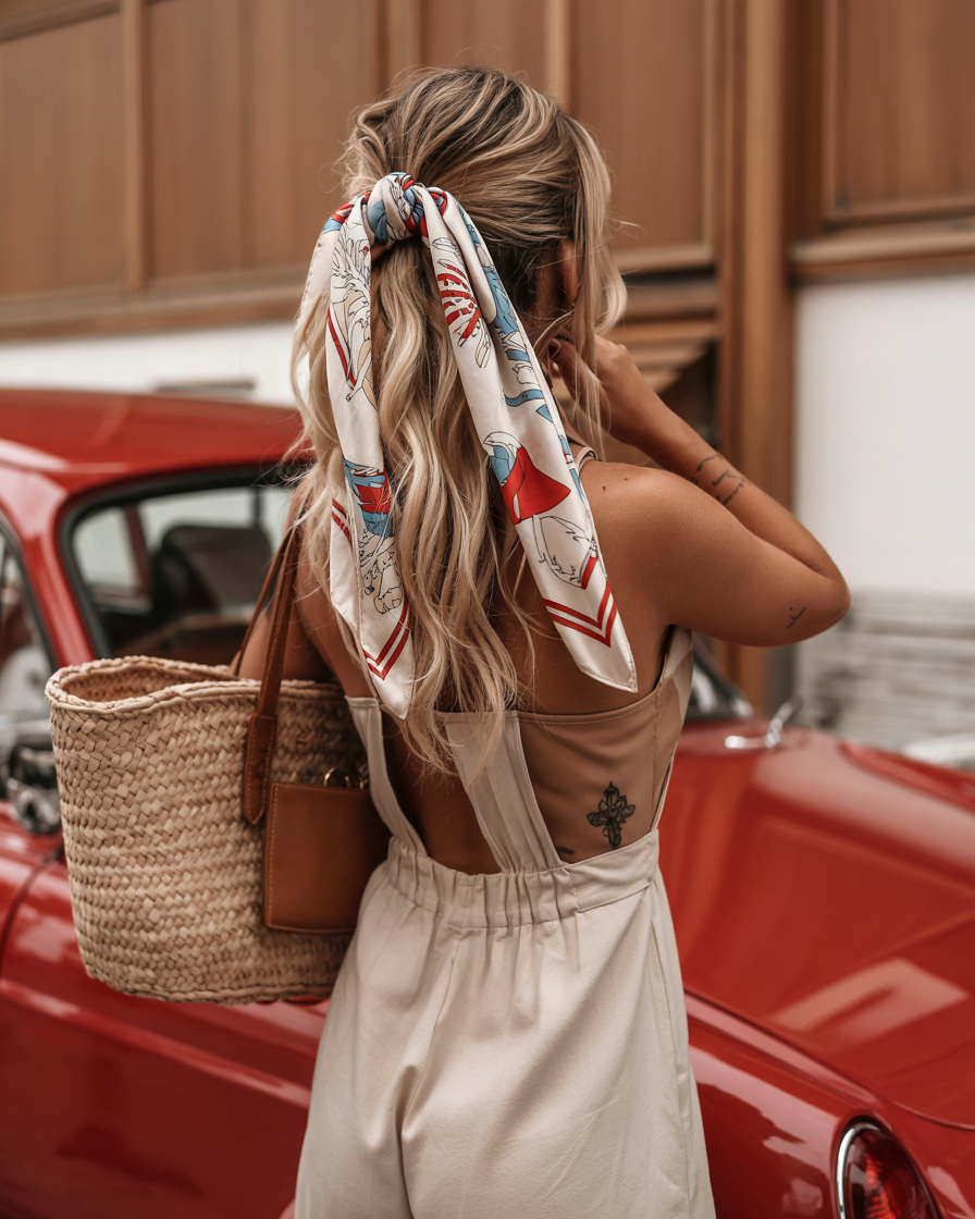 Golden waves and a warm satin scarf are something eternal. This type of style exudes casual sophistication, the type of appearance you would wear to a late night out in summer or a brunch outing with your girlfriends. The shine of the scarf combined with flowing curls is a wink at both old-fashioned glamour and minimalism. It is subtle, but undoubtedly stylish.