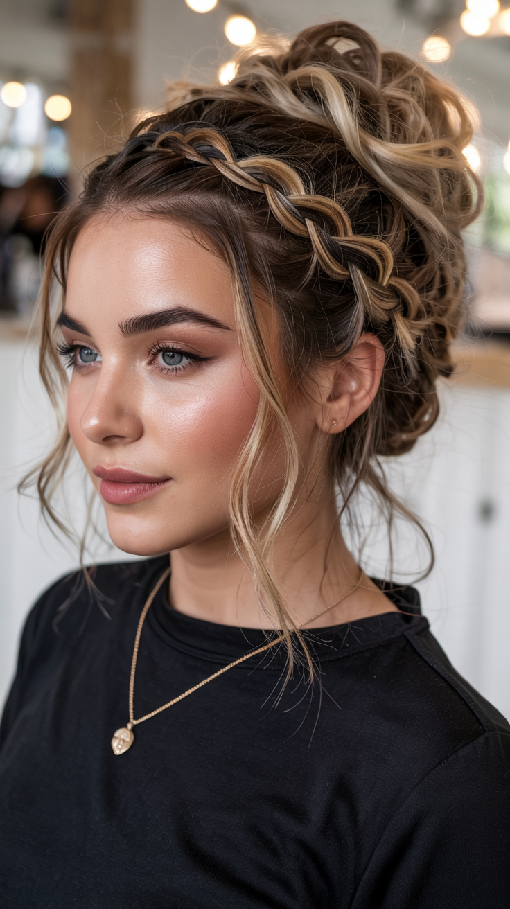 It is undoubtedly graceful to plait hair into a crown and to wear it with gentle waves of hair around the face. There is a royal but friendly touch to this appearance – it is red-carpet ready and at the same time, fresh enough to spend a night out. The inclusion of a detail in the form of a scarf or a ribbon adds a fun contrast to make it contemporary and personal.