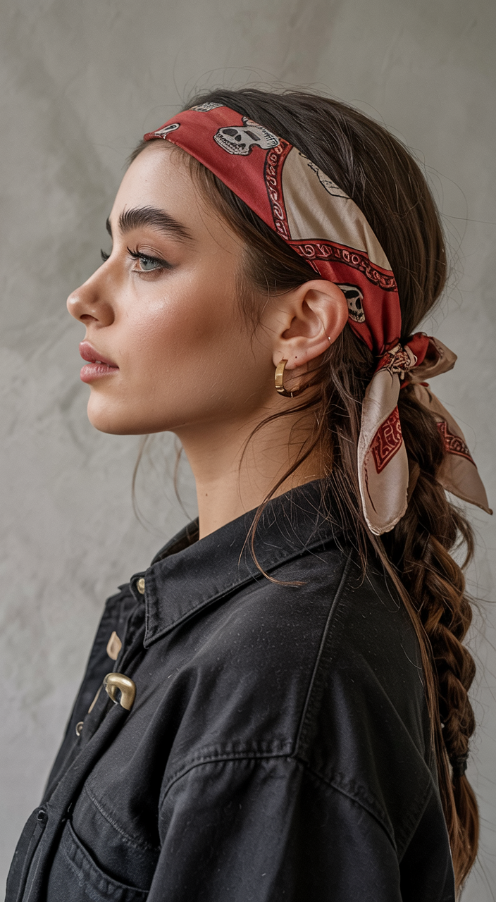 This style suits very well with long silky hair or even short curly hair as long as you braid a few of the front strands and slip them under. The scarf makes everything fit together and holds flyaways at bay, making it useful during a windy day. Especially flattering when you are trying out a braid and just need a way to frame the face without investing in a full braid look. Imagine it as your quick ticket to easy cool, just grab a bandana, tie two strands and you are ready to go.