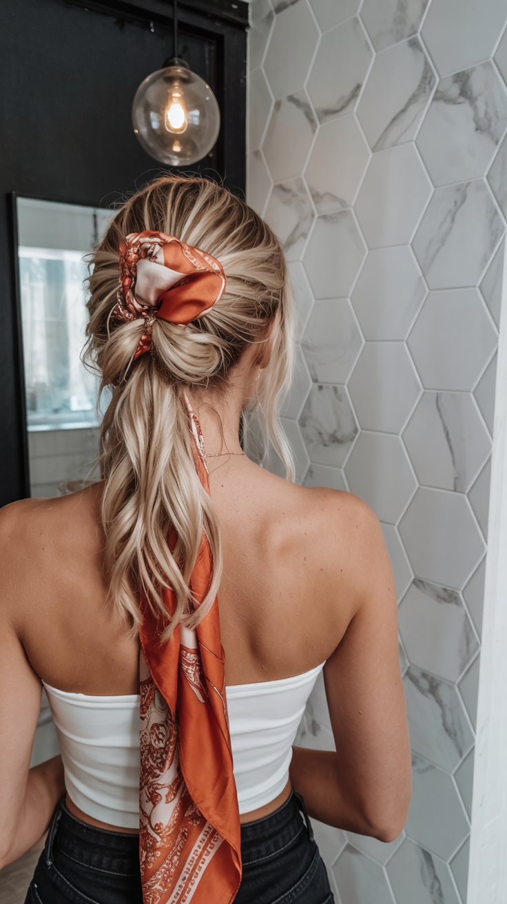 Sloppy waves brushed up in a low ponytail with a paisley scarf immediately seem like a blend of the rustic and chic. It is charming and tidy, informal and presentable. The way the scarf knots around has a touch of 60s nostalgia, but it also feels entirely up-to-date in 2025, particularly when you want to feel like you just tied it and strolled out the door.