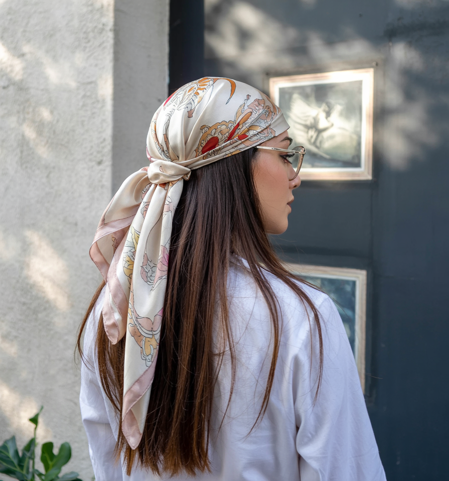 A smooth scarf in sunset colors is sometimes all you need to make your appearance shine. It is a smooth but casual hairstyle, the type of scarf you would put on with a loose blouse, gold earrings and a glass of wine on the balcony. The manner in which the scarf is knotted on the side makes the mood playful and the soft material reflects the light well.