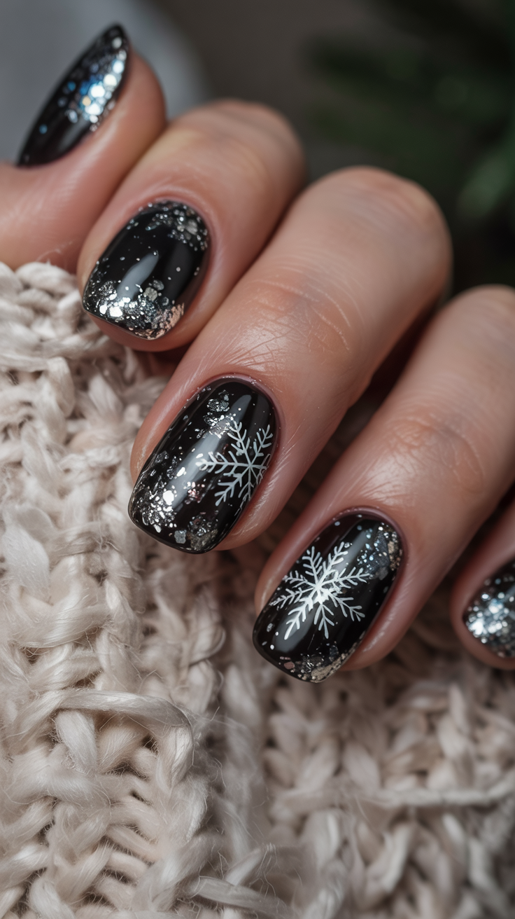 Something about black nails with silver shimmer is so magical, it makes you feel like you are looking at a clear night sky and snowflakes are floating down quietly. This design is daring and elegant and fits winter evenings with warm knits. The snowflake detail is white and thus immediately festive without losing its modernity.