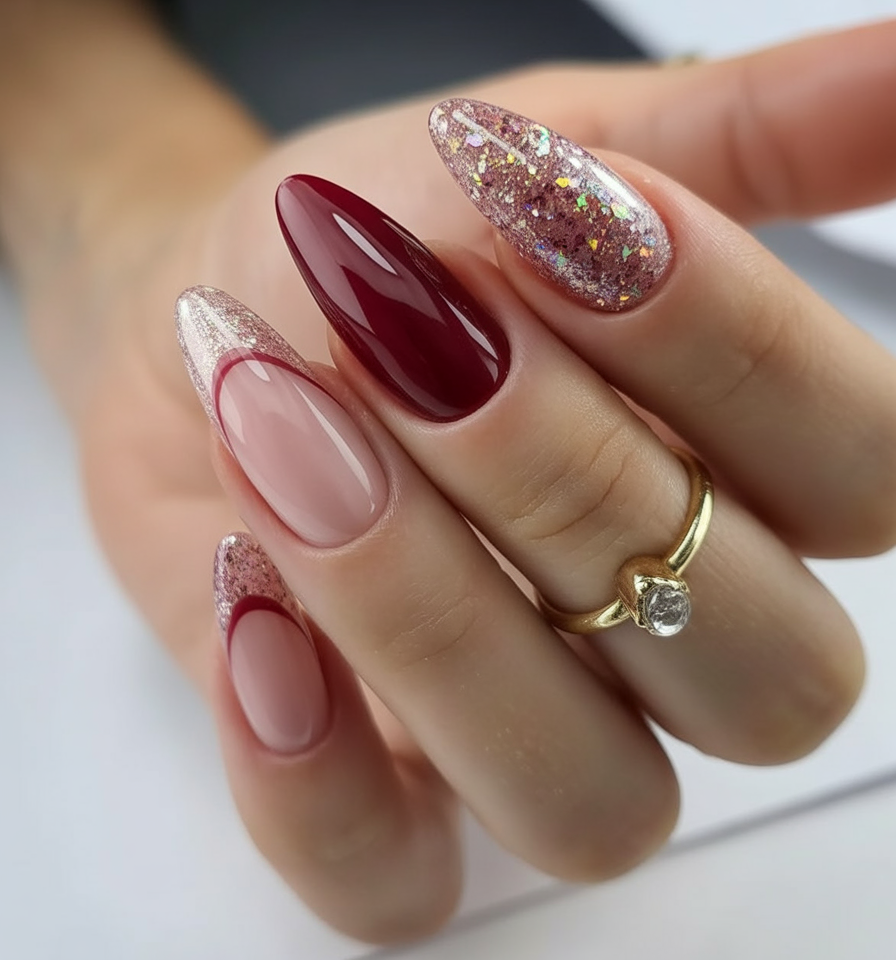 The notable thing about this design is its versatility. This can be worn anywhere, whether one is going to a christmas party or just going out to buy stuff. The almond shape makes the fingers longer and the combination of designs that are easy to wear such as solid red to glitter tips makes it one of the hottest trends of 2025.