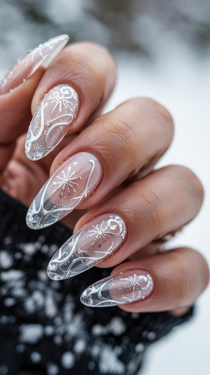 These fine white lines on transparent nails are cold patterns on a frozen windowpane. It is motion and plushness, almost as though it were winter wind blowing through the air. Their lightness and grace is brought about by the transparent base that ensures they are an effortless winter designs inspo.