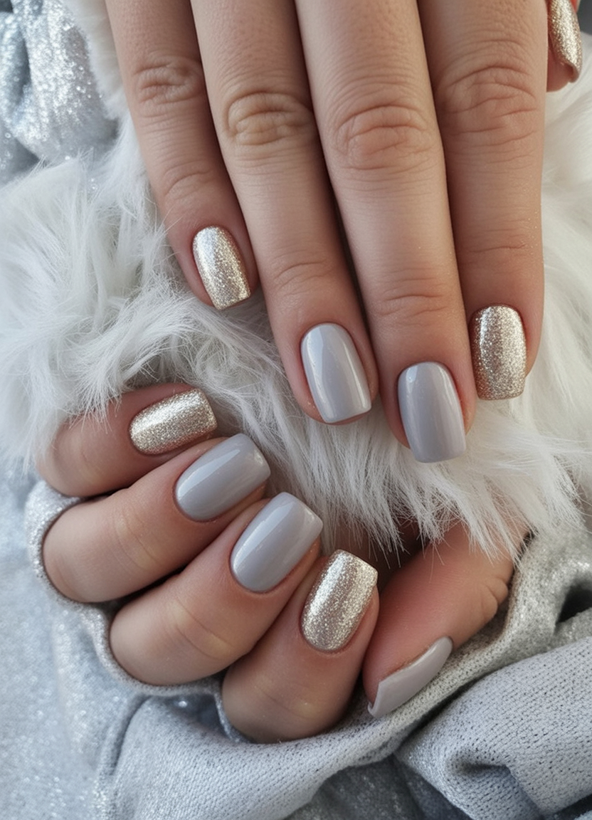 The final icy couple is cool grey and glittering silver. These square nails are short and shiny, not too glittery to add holiday cheer to your style. They are contemporary, but classic at the same time, a hint of winter and still stylish enough to wear all year round.