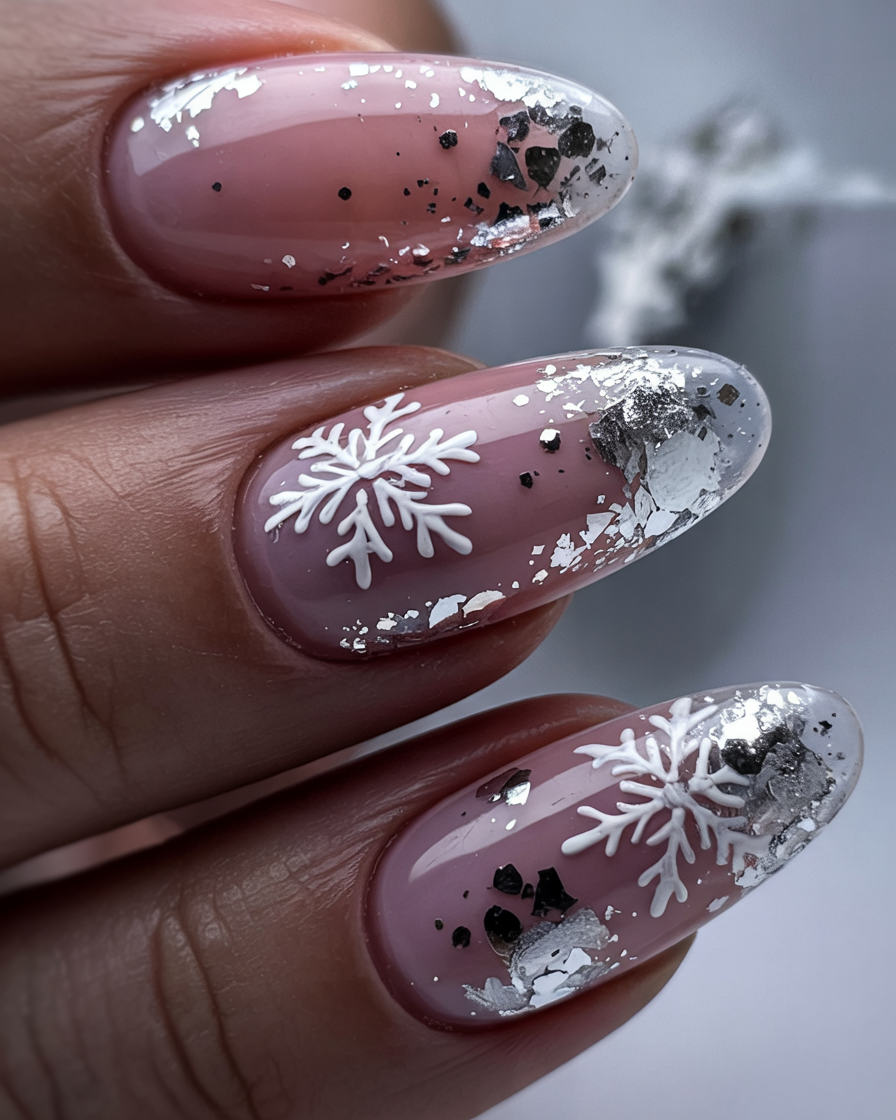 Silver foil and snowflake decorations on pale pink nails are like frost on a windowpane. They are fragile, contemporary and a bit gritty simultaneously, a beautiful combination of lushness and glitz. The bits of silver scattered on them make every nail appear to be its own little artwork.
