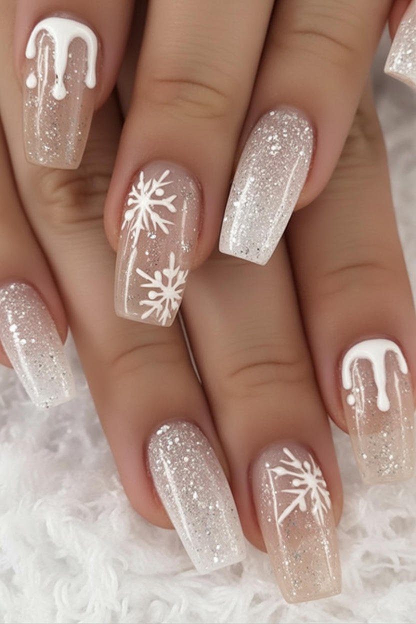 Nothing is more winter than glittering snowflakes and drip details. These glittering square nails are iced cookies with sprinkles, joyful and entertaining but at the same time classy. The glitter base shines lightly in the light and is ideal in the holiday season.
