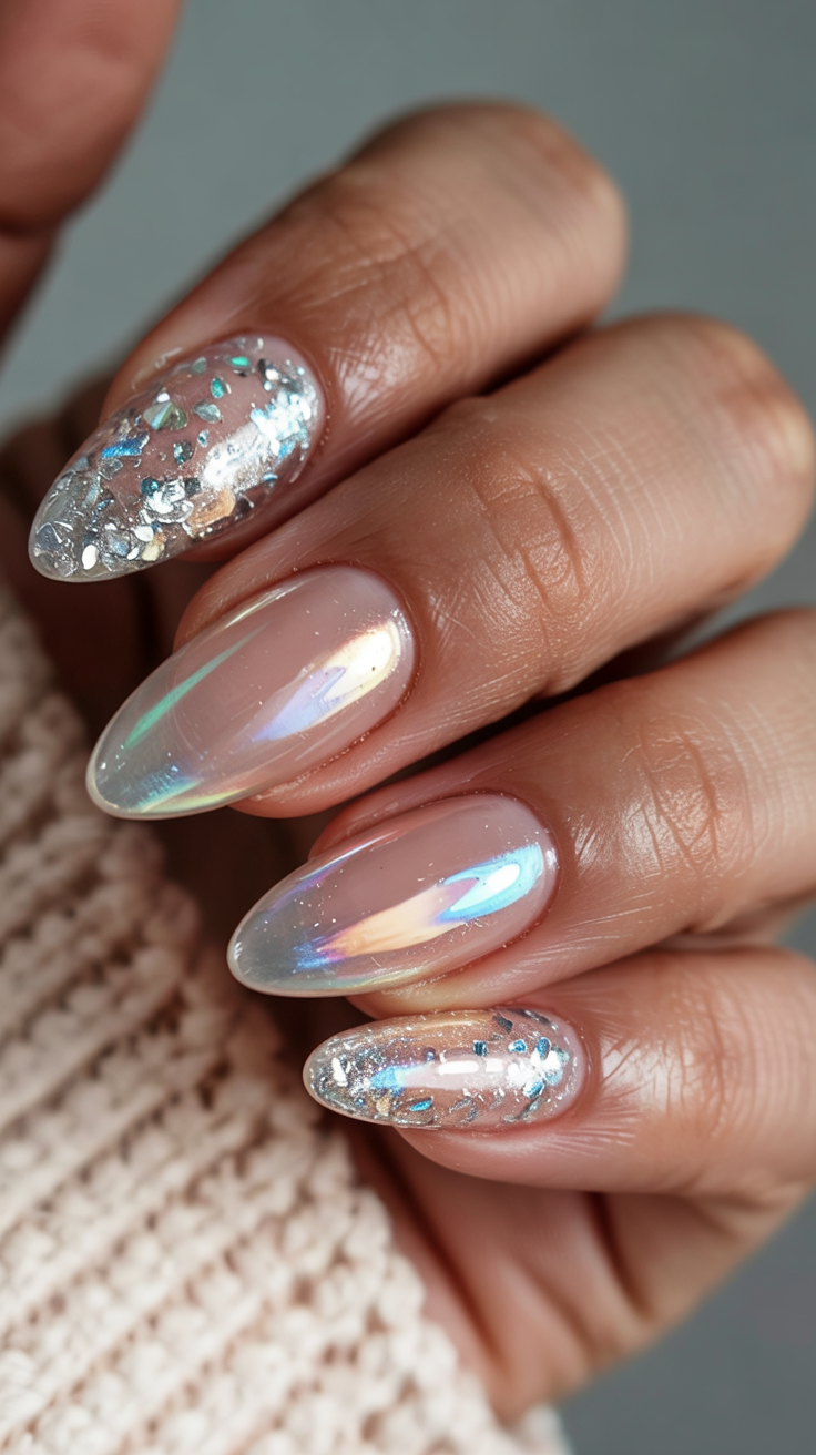 Glitter-accented ice-crystal catching soft, glowing iridescent nails, feel like ice crystals catching the light on a sunny winter day. This design is gleaming with faint rainbow colors making it airy and glamorous simultaneously. The almond figure makes it classy and the glitter nails provide the festive twinkle.