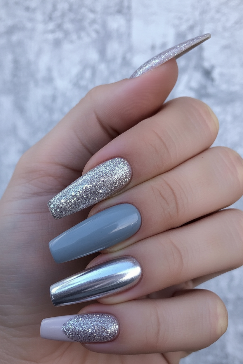 The definition of winter inspo is long nails with frosty silver, icy blue, and glittery finishes. Chrome accent creates a futuristic feel, the glitter makes it soft with holiday sparkle. It is dramatic, but still wearable, such as a snow queen perfect manicure.