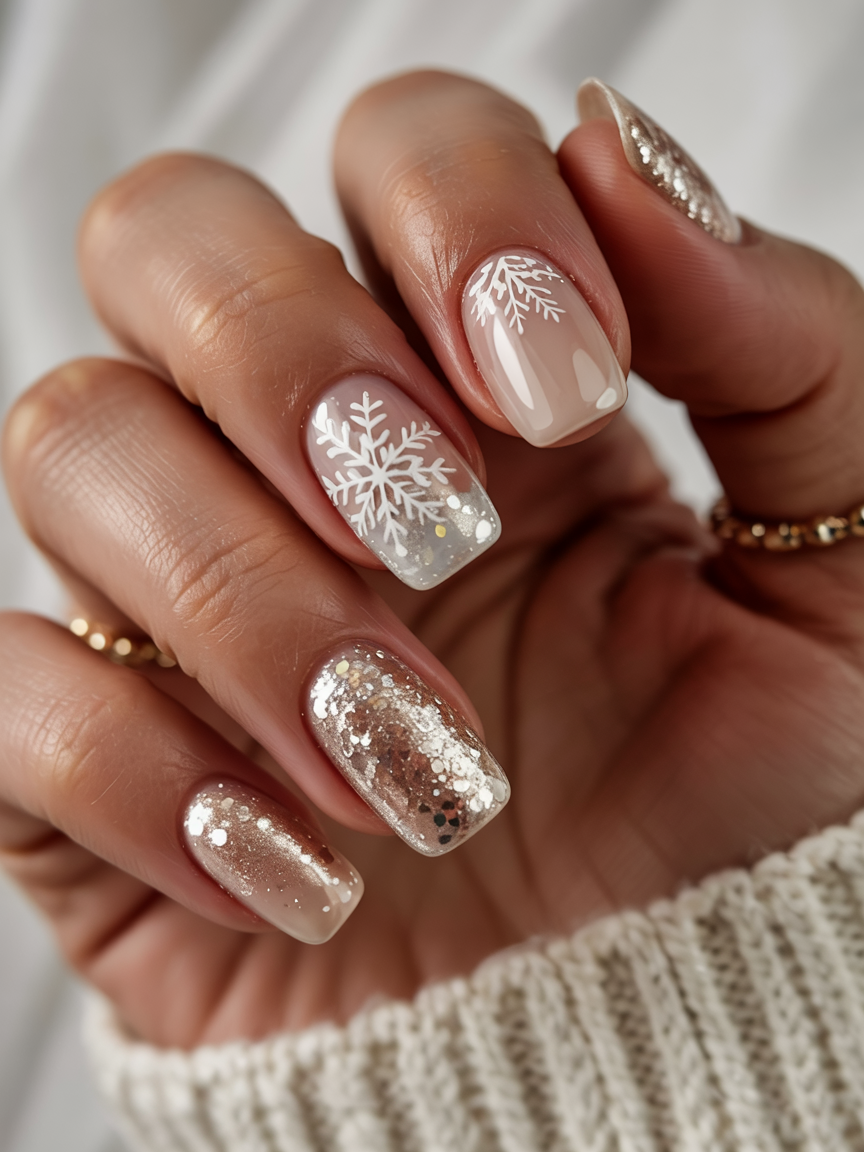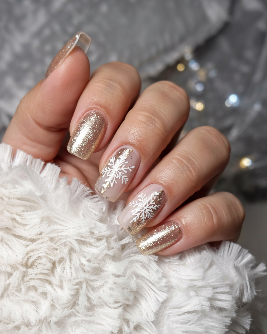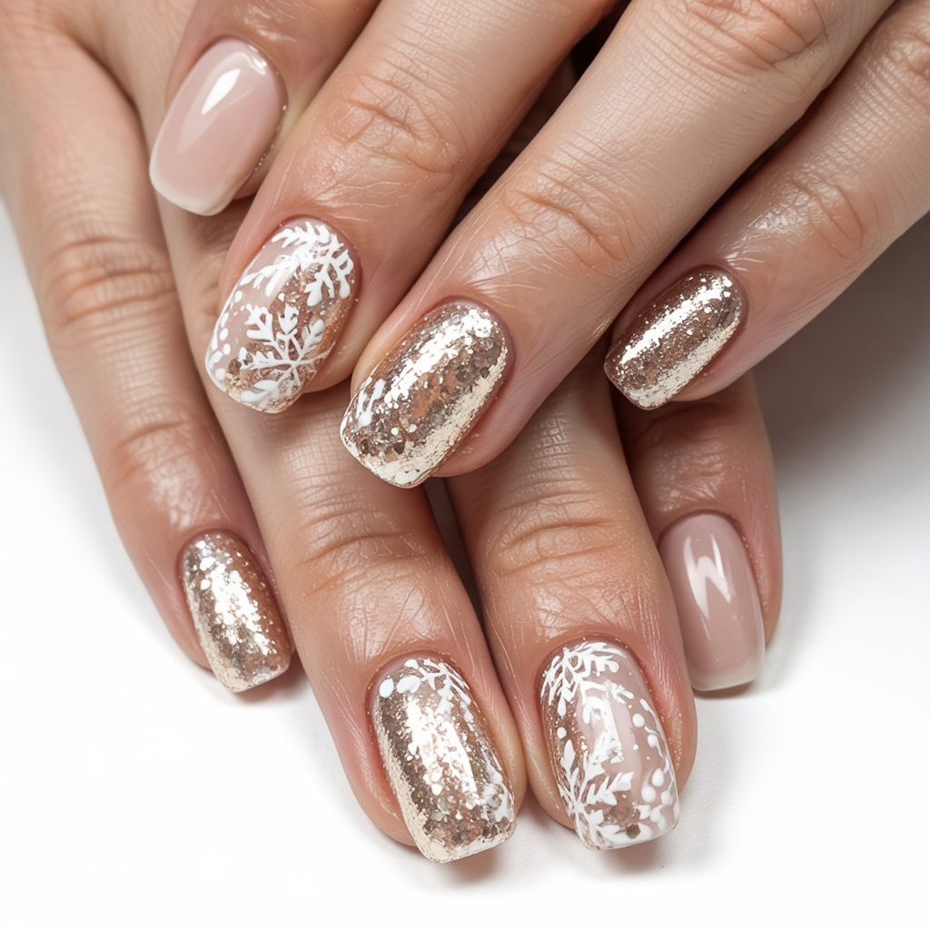 Cosy bronze glitter and delicate white snowflakes are combined to form a classy winter look. It is celebratory and grounded, a bit more surprising than gold or silver. This mix renders it particularly stylish to people who appreciate warm, sophisticated sounds.