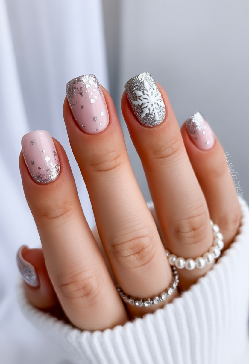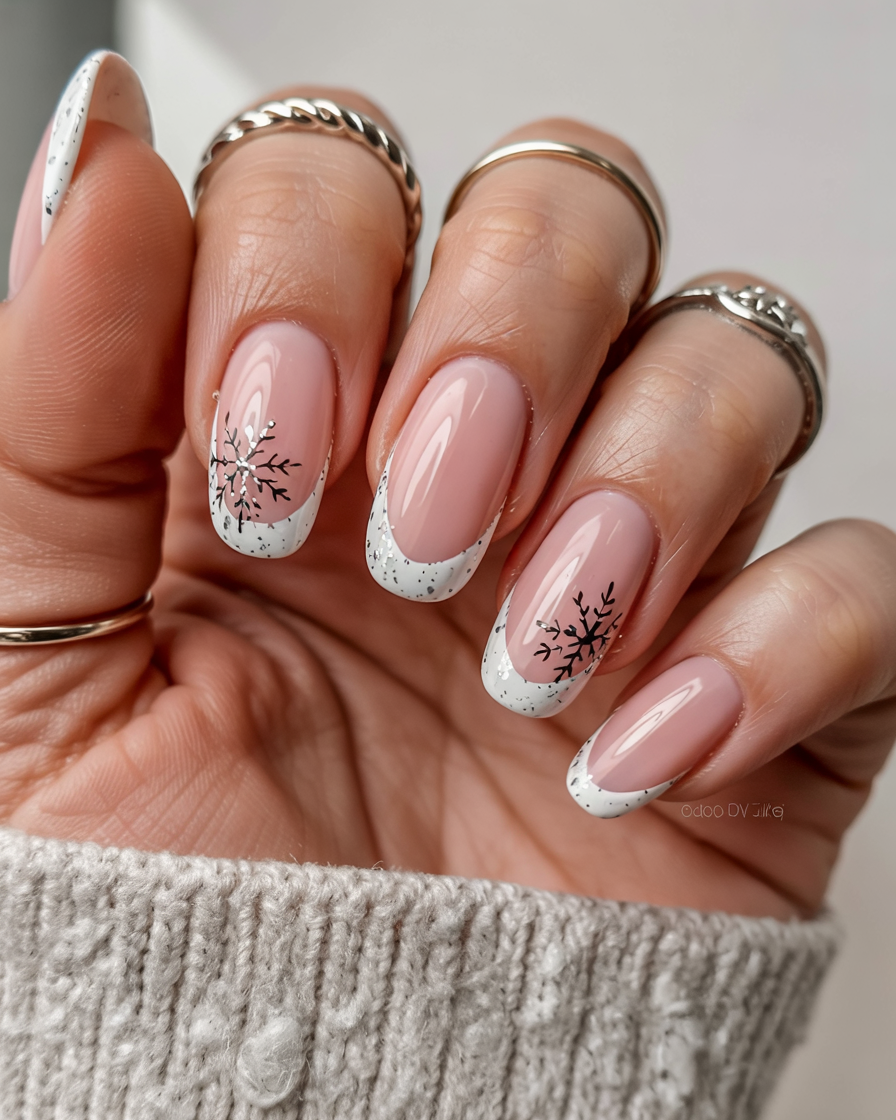 This design is a twist to the traditional French tip. The white tops are faintly sprinkled with silver, like snow-tipped edges, and tiny snowflake accents make it wintry. The outcome is sleek and new, ideal to give a seasonal rejuvenation.