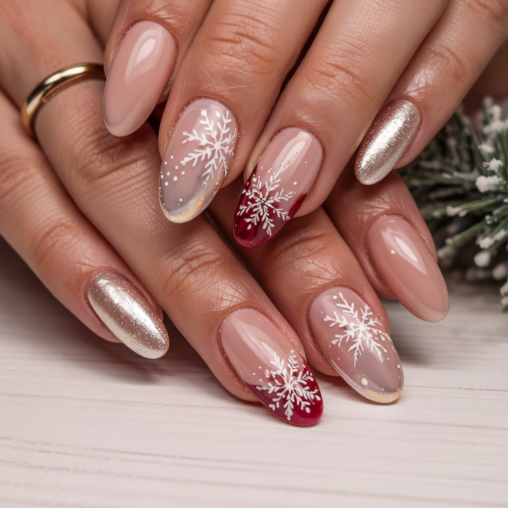 Here is a happy combination of gentle neutrals, glitter and bright red ends – all bound together with the delicate snowflake patterns. It is both playful and glamorous simultaneously and is ideal to the lady who likes to add a bit of inspo acrylic to designs red and designs gel finishes. It is a winter celebration in a single manicure.