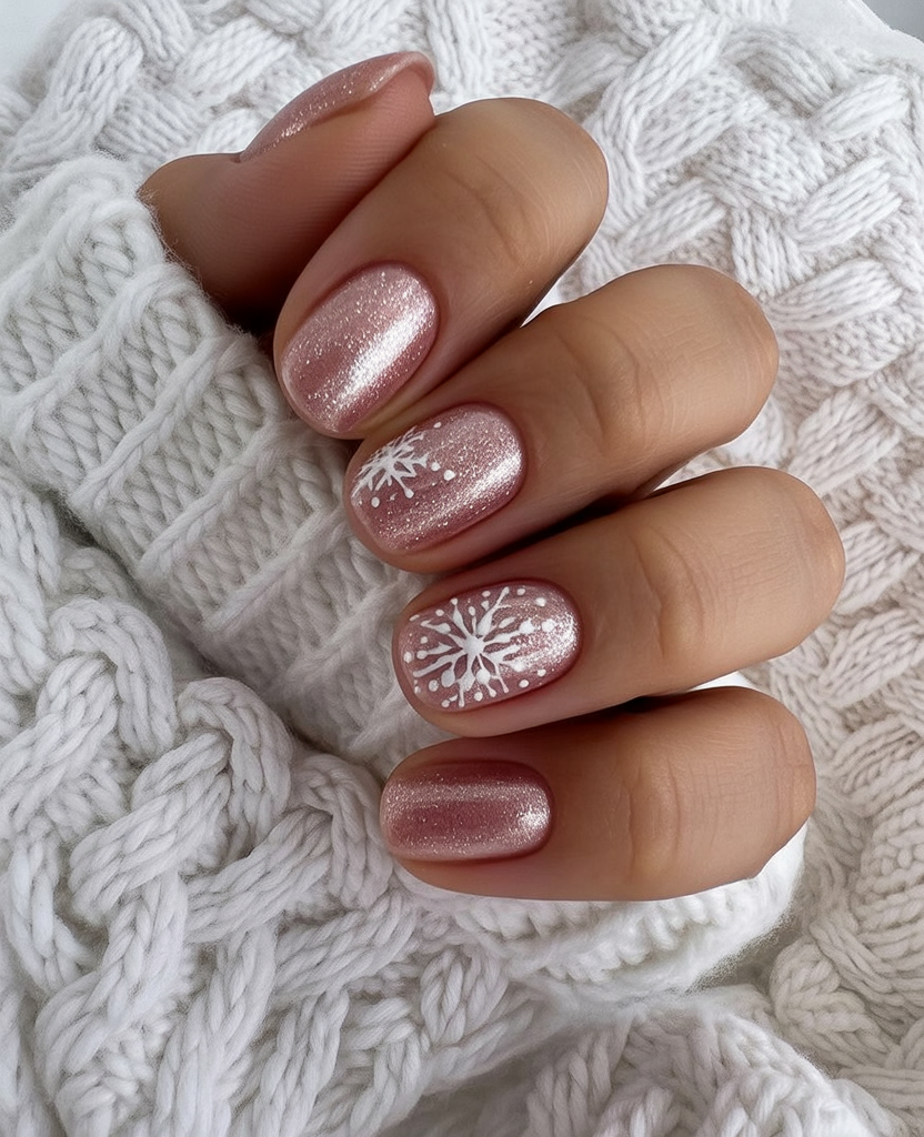 The sweetness of winter mornings when the frost sparkles on the windows like tiny diamonds is caught in these shimmering pink nails. The snowflake detail is delicate enough to give it a seasonal touch and the rosy bottom makes it feminine and elegant. It is such a design that you can smile whenever you look down.