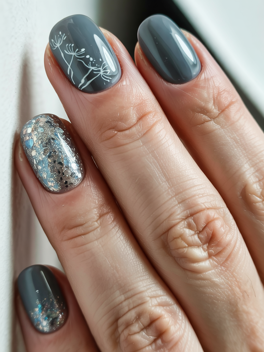 Dark gray nails with accents of silver glitter are like a stormy winter evening – stormy but surprisingly stylish. The hint of white floral detail gives the impression of light contrast that prevents the design to be too heavy. It is a style that somehow works out to be dramatic and soothing at the same time.