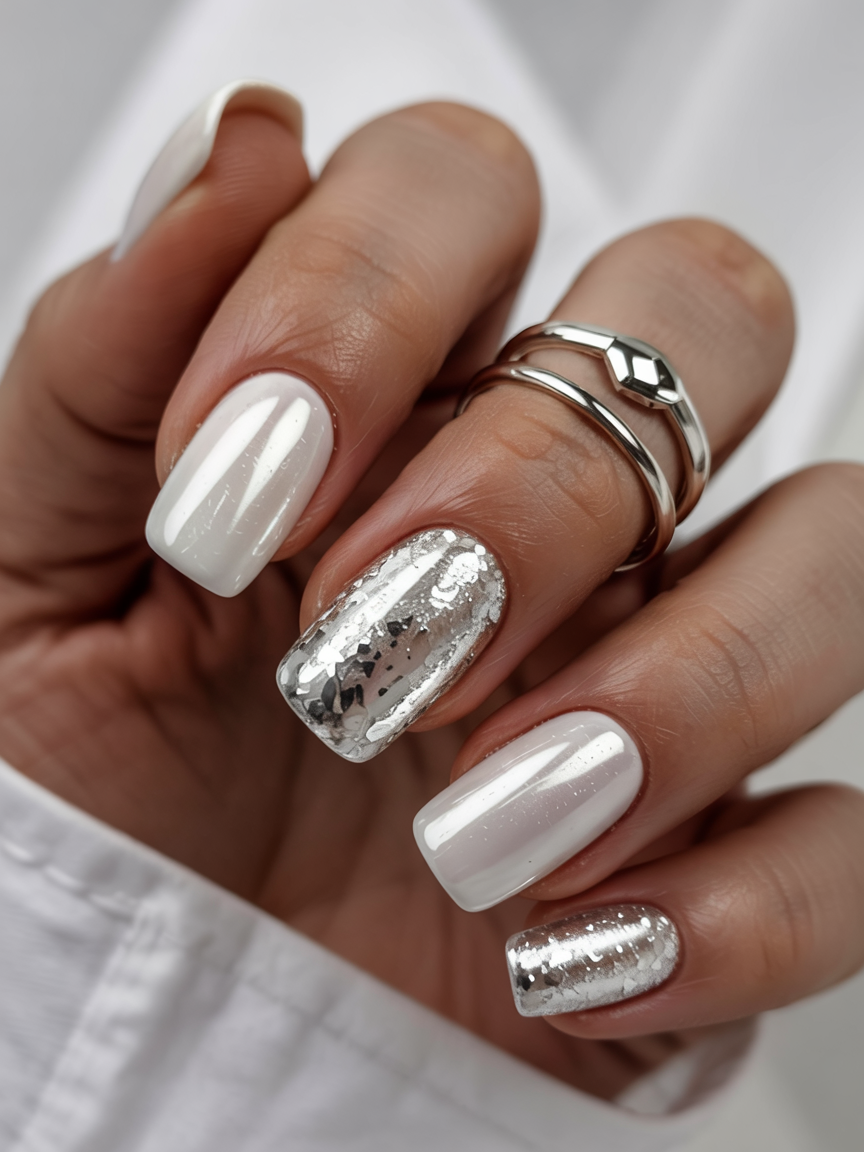 Big silver glitter nail accents on pure white nails are like fresh snow glittering in the sun. This look has a crispness that is certainly wintry and the sparkle is festive. It is sleek and neat, and anyone who adores the designs that are simple but having a touch of glamour will find it ideal.