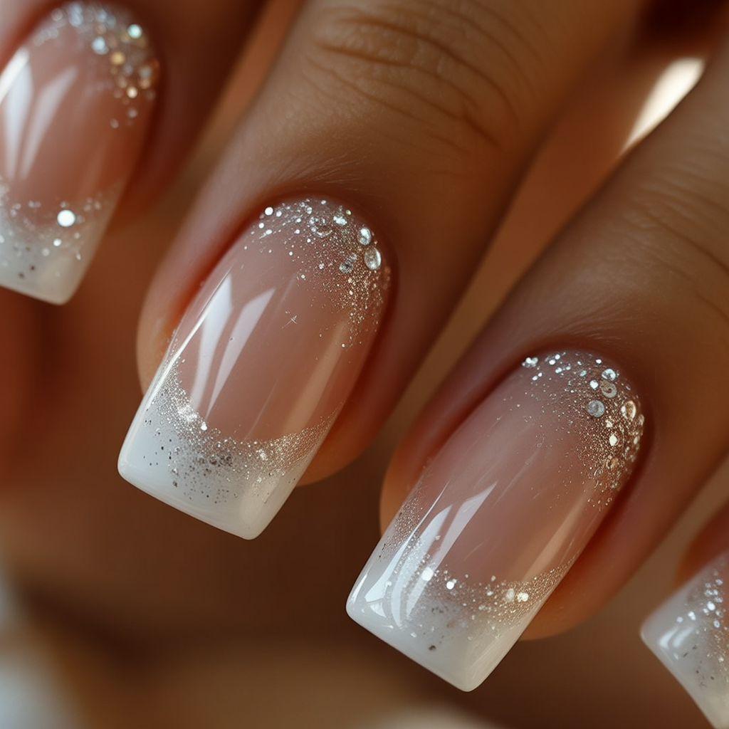 It is a contemporary version of the French tip, which is winter luxury. The gentle shading between nude and white is sprinkled with little crystals, as frost lightly settling in the dawn. It is subtle but noticeable and thus it suits women who love class with a touch of style.