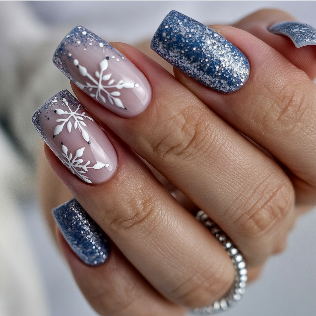 The deep blue glitter nails are contrasted with tiny snowflakes of white color. The impact is striking and harmonized, and it reminds of the appearance of snowy skies in the moonlight. It is a manicure which is festive and at the same time classy.