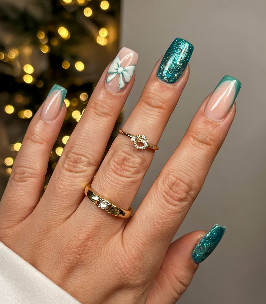 Bright teal glitter nails with fun-loving ribbon embellishments are like opening a gift on Christmas morning. The combination of glittery teal and smooth nude bases make it fun and festive, and the bow detail makes it whimsical.