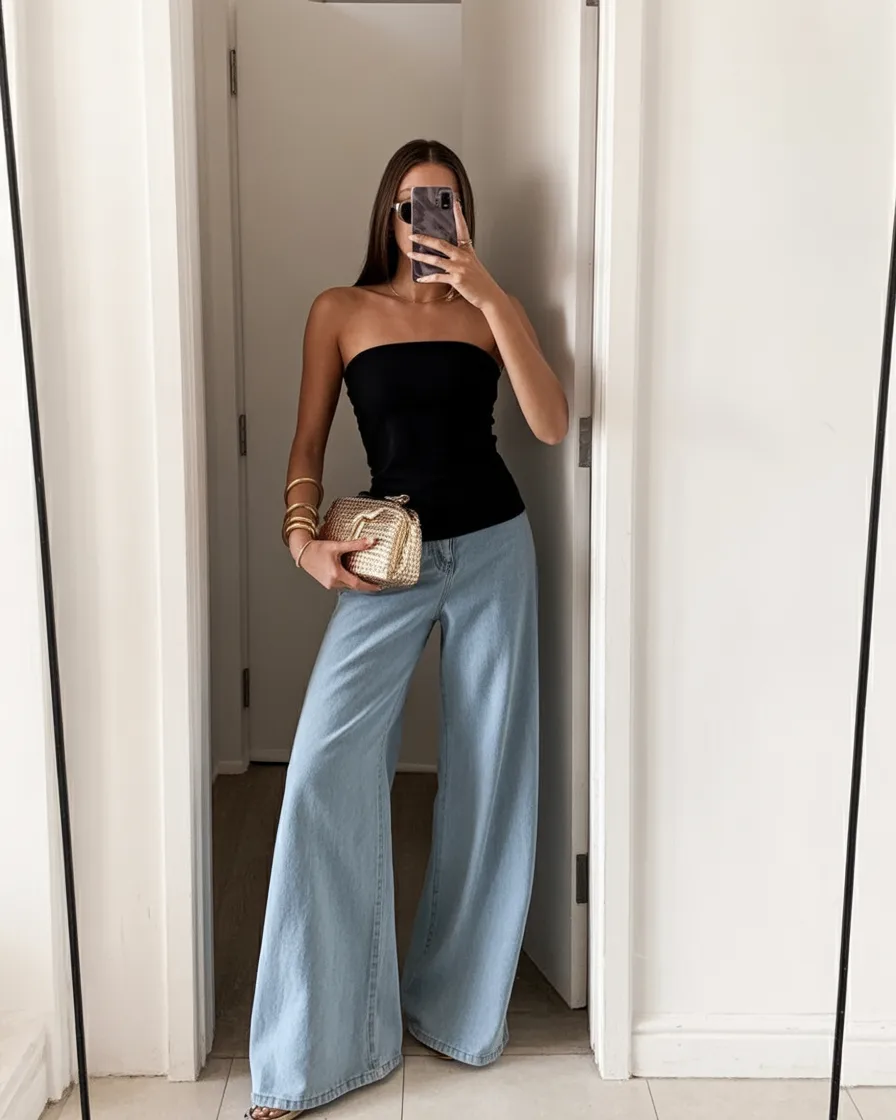 There’s something quietly powerful about this outfit. The clean black strapless top paired with soft, flowing denim feels timeless and Classy, without leaning too formal. It’s minimal in the best way — simple lines, calm colors, and an effortless silhouette that feels grown, confident, and very chic.