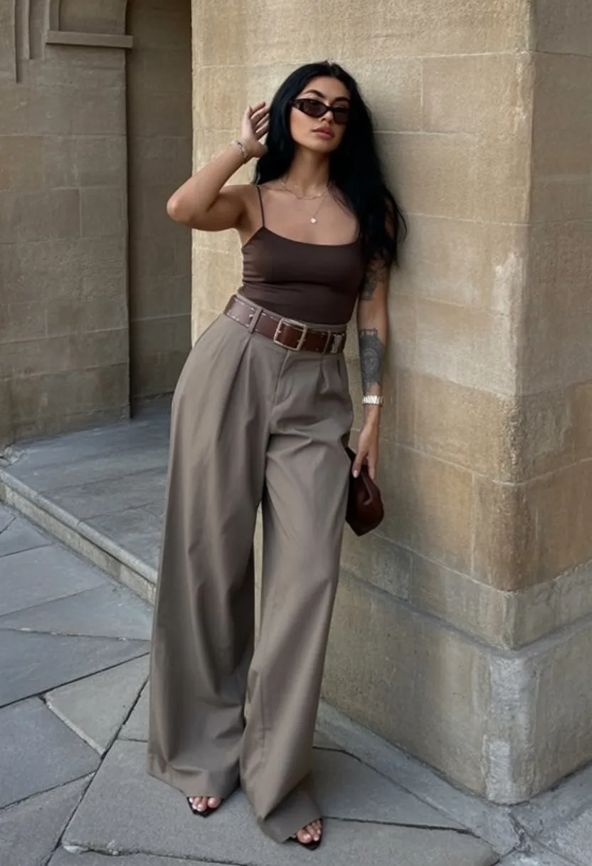 This outfit feels confident, grounded, and quietly powerful. The neutral sleeveless top paired with fluid black pants creates a clean, grown-up silhouette that instantly reads chic without trying too hard. It’s the kind of look that makes you stand a little taller — understated, intentional, and effortlessly stylish, perfect for Women who love simplicity with substance.
