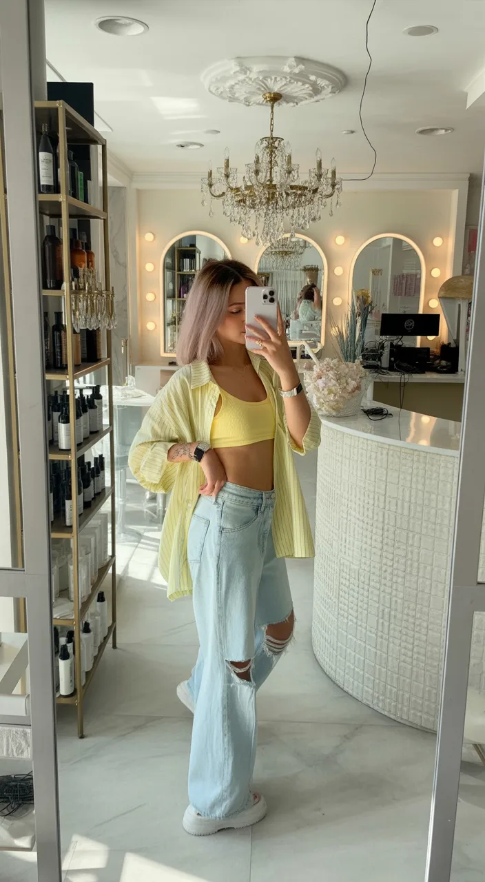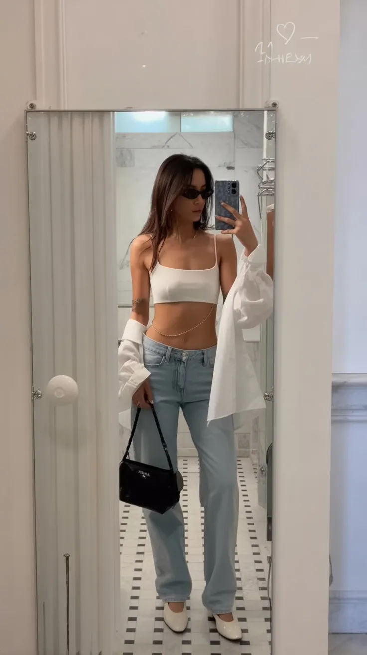 This look captures an effortless, modern, and relaxed mirror-selfie charm. The setup is clean and fresh, and the cropped white top paired with light denim instantly expresses casual and confident.