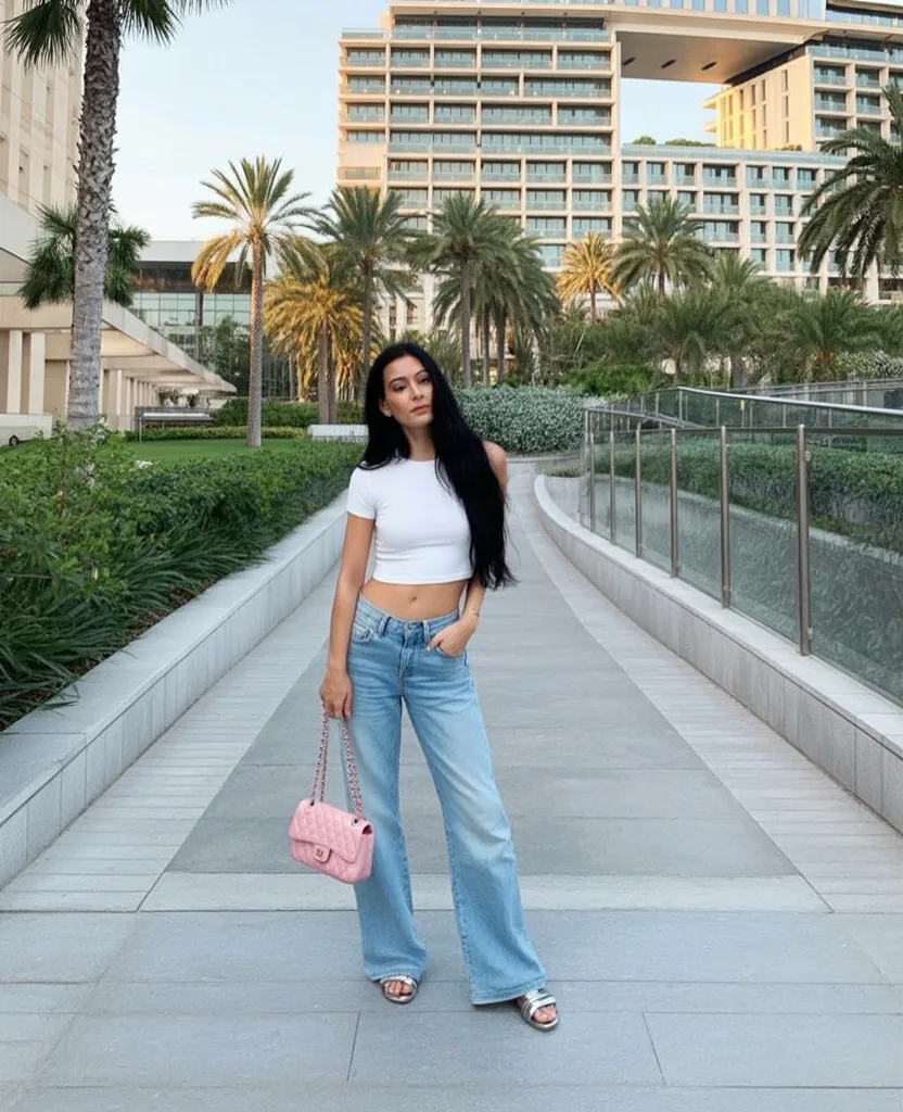 This look is pure everyday ease. Relaxed, confident, and totally unfussy, it feels like something you’d wear on a real day — not just for photos. The simple tank and wide-leg jeans give off a Casual, laid-back vibe that still feels intentional and chic in the most natural way.