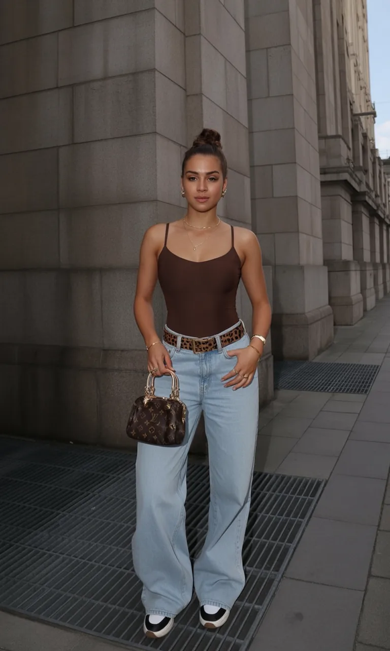 This outfit gives major bold confident city girl energy. The combination of the cropped tank, wide-leg jeans, and cap is playful and sporty. It’s casual chic, with a touch of attitude, like you’re walking downtown with an iced coffee in hand, totally relaxed and comfortable in your own skin.