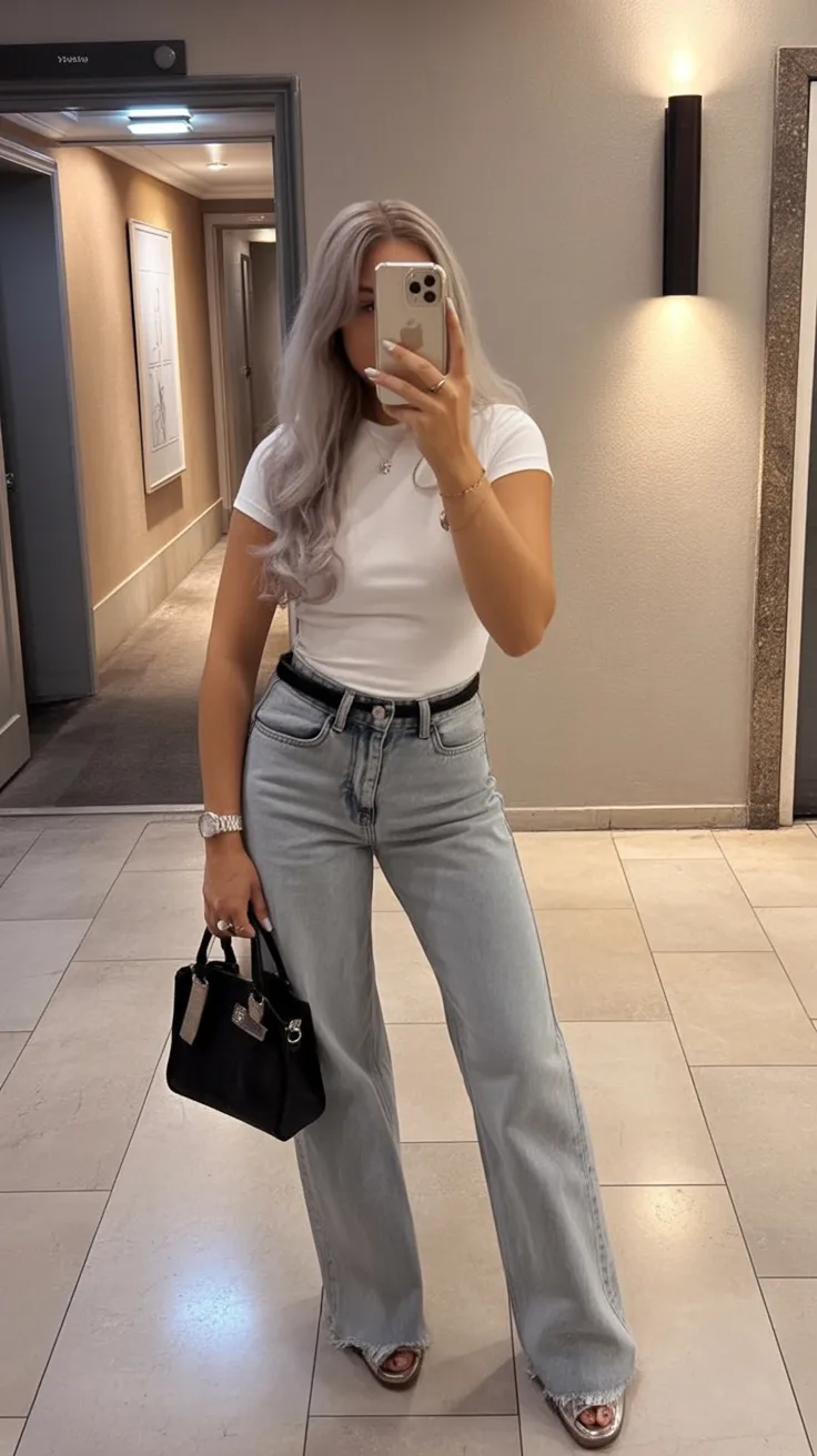 This look is proof that simple can still feel powerful. The clean white tee and light-wash denim create a timeless combination that feels fresh and easy. It has that quiet confidence that never goes out of style — relaxed, approachable, and effortlessly chic.