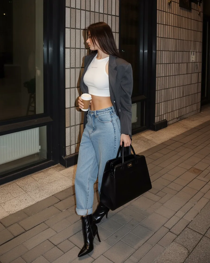 This outfit blends relaxed and polished in the best way. The cropped top and denim feel casual and modern, while the structured jacket adds a sharp, confident edge. It’s Casual chic with attitude — stylish, practical, and very city-ready.